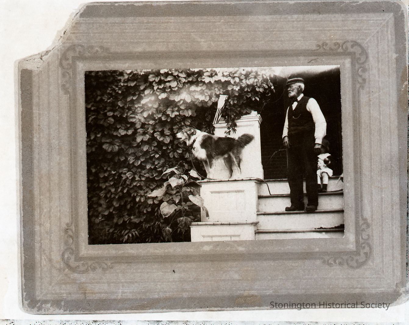 Photo taken of lighthouse keeper on front steps at home with dog to left and small child seated behind. Negative was found at the Lighthouse and printed inhouseCollection