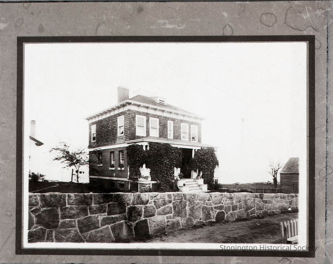 Photo taken of lighthouse keeper's house with stone wall and lots of foliage. Negative was found at the Lighthouse and printed inhouseCollection