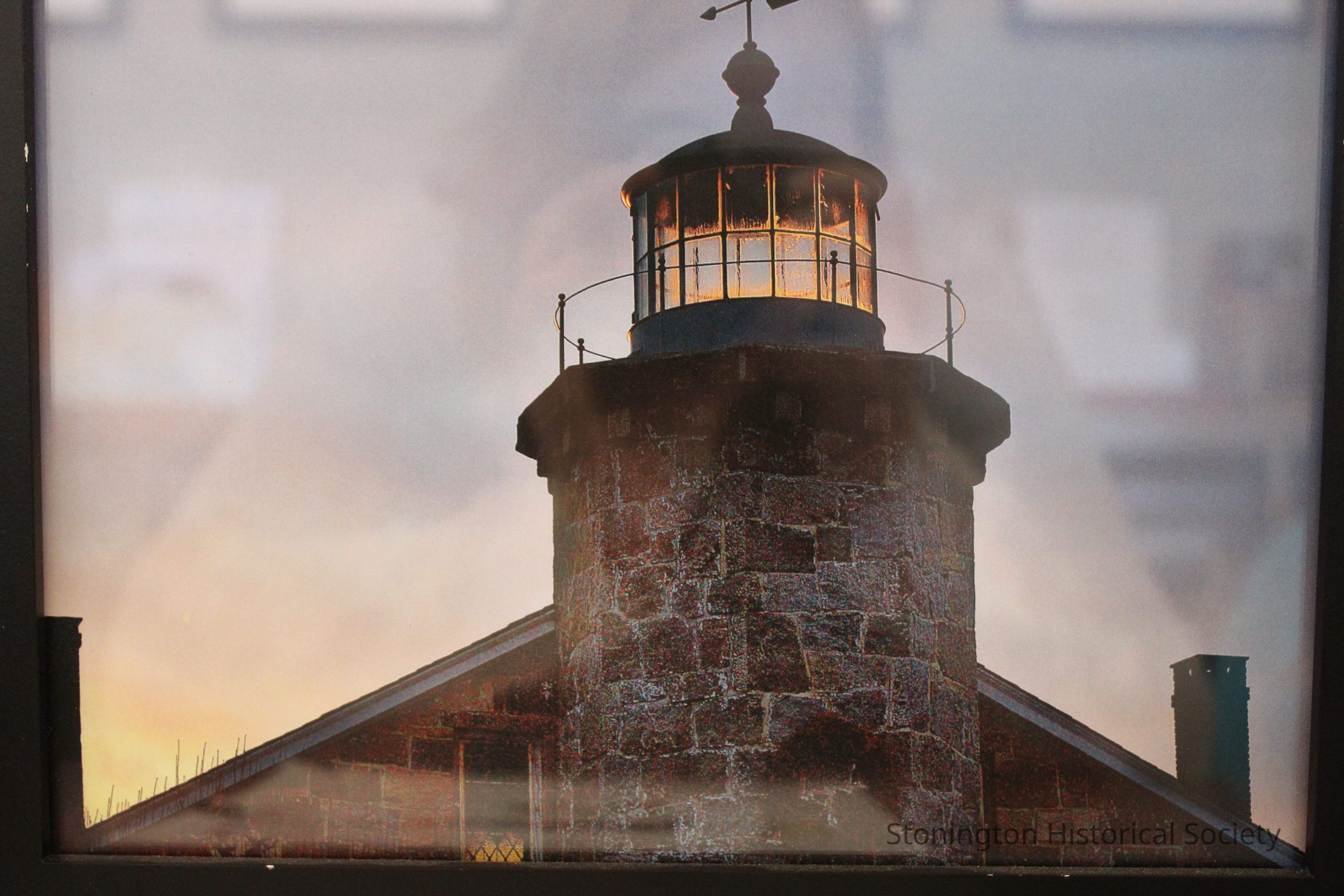 A framed photograph of the Lighthouse tower at dusk. Probably taken by a staff member of SHS as there is no identifying information printed on the back of the photograph. This was probably hung in the Lighting the Way exhibit at the LaGrua Center in January 2018.Collection