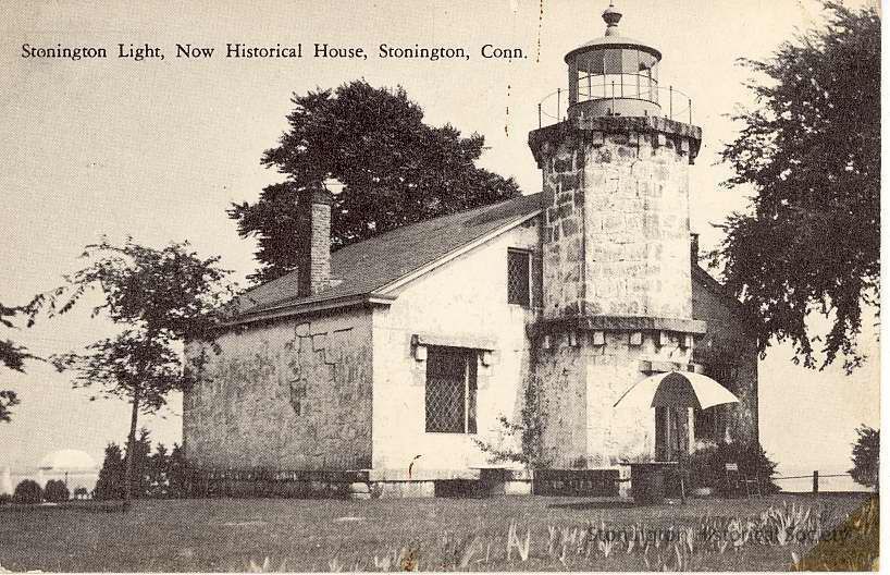 Postcard of Stonington Light, Now Historical House, Stonington Conn. showing umbrella set up in background to left. Date on back, 1934