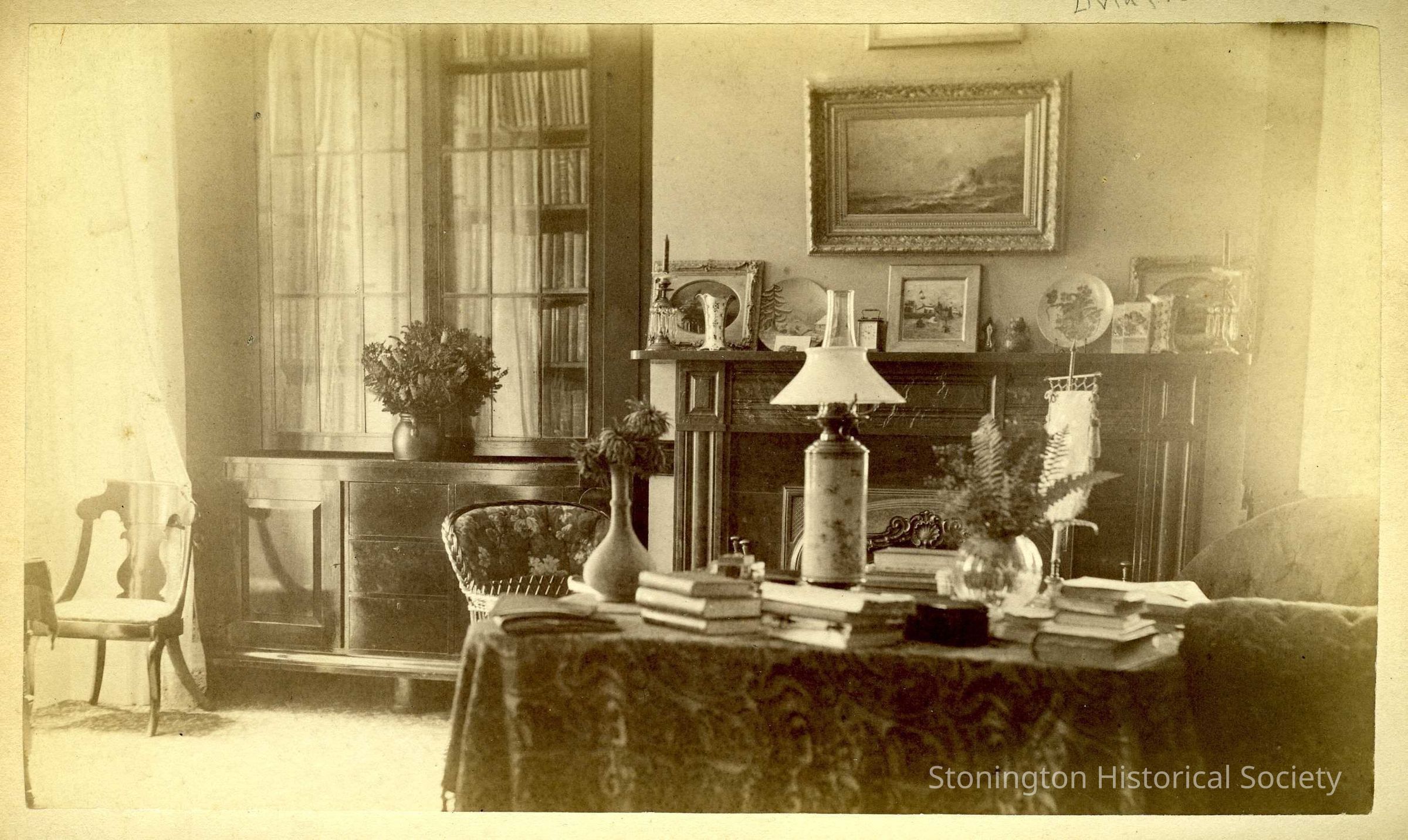 An interior photograph showing the living room at Stone Acres Farm. As you enter the front door, this room is immediately on the left. The portrait of Charles Phelps in our collection, originally hung over this fireplace. The large wooden bookshelves are still in place.Collection