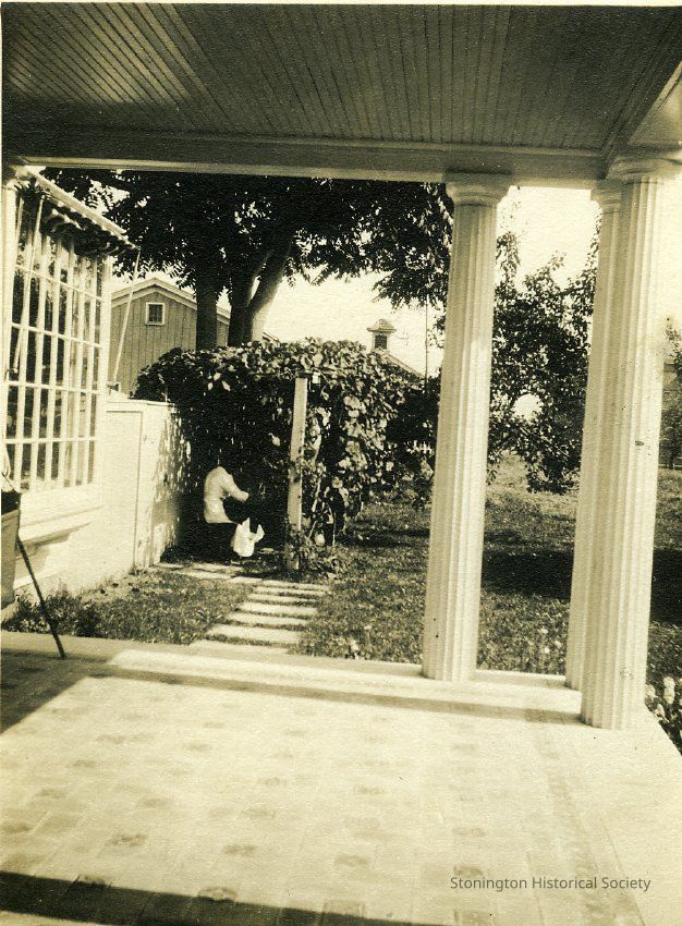 Looking at covered walkway with person from porch at "The Hill," residence at 35 Grand Street