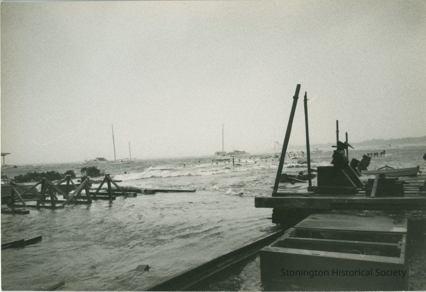 Looking out at Stonington Harbor from flooded boatyard/marina