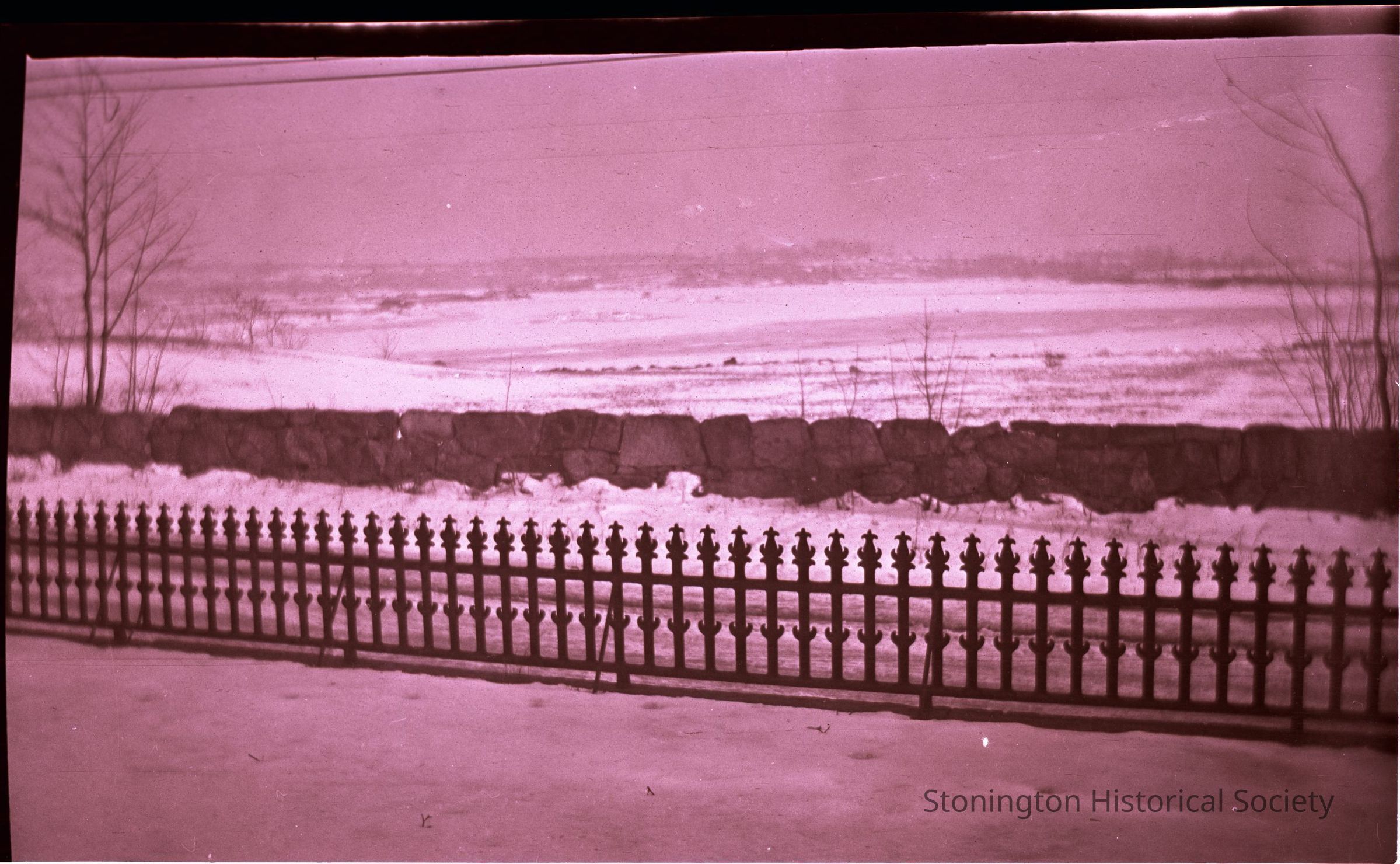 Looking across metal fence to Lambert's cove in winter View from west lawn of the Palmer House.