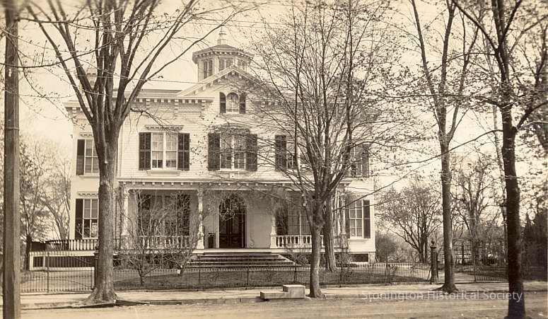 Card showing house at corner of Broad Street and Water Street. Notes on back indicate it was the Loper-Palmer-Robinson house. "What a shame this beautiful house demolished 1941 to make way for US Post Office. Days of loveliness gone!"