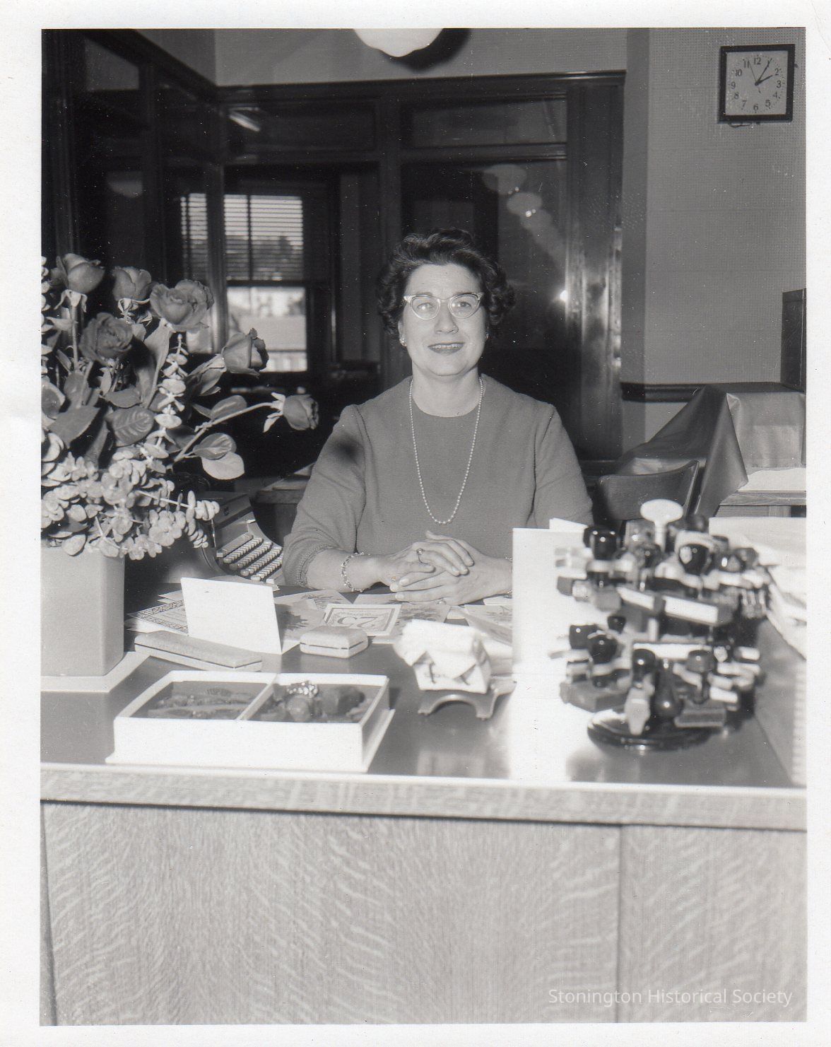 2 black and white photographs of Lucretia Ernest Tubbs celebrating her 25th anniversary working for Amica Insurance.