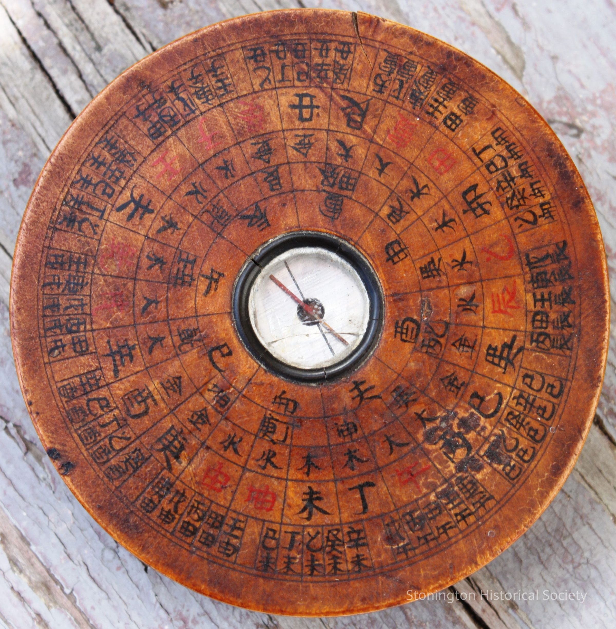 Feng Shui compass. This geomantic compass, known as a luopan or feng shui compass, is a Chinese magnetic compass used to determine the best direction for a structure, place of item. It would have been used in the practice of feng shui, which is the Chinese system of geomancy, or the art of orienting buildings. At the center of the compass is a small shallow bowl, containing a dry-pivot needle, which points south. Surrounding the bowl are five concentric rows of circles, divided into segments and marked with symbols or Chinese characters. The fourth row is split into 24 parts indicating the traditional azimuthal directions. Azimuthal refers to a horizontal direction measured as an angle from a reference point – it’s a way to describe a direction on a flat plane using degrees, where 0 degrees is north, 90 degrees is east, 180 degrees is south and 270 degrees is west. The red and black characters on the compass represent the pure ying and pure yang. This compass was most likely purchased in China by Captain Frank Noyes, the donor’s father, around 1830.