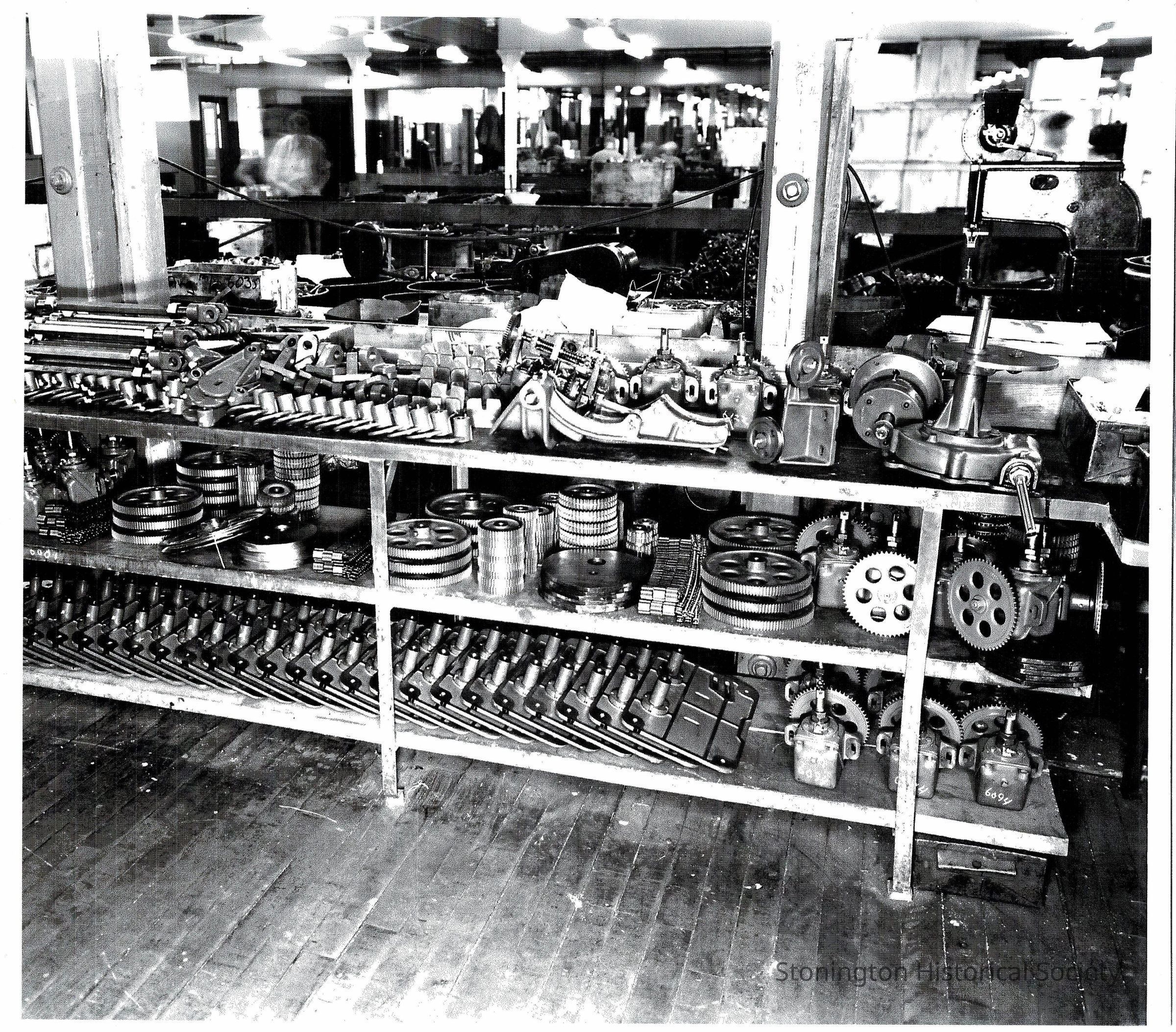 A photograph taken inside the Atwood Machine Company in the 1940s, showing a shelf with various machinery parts.Collection