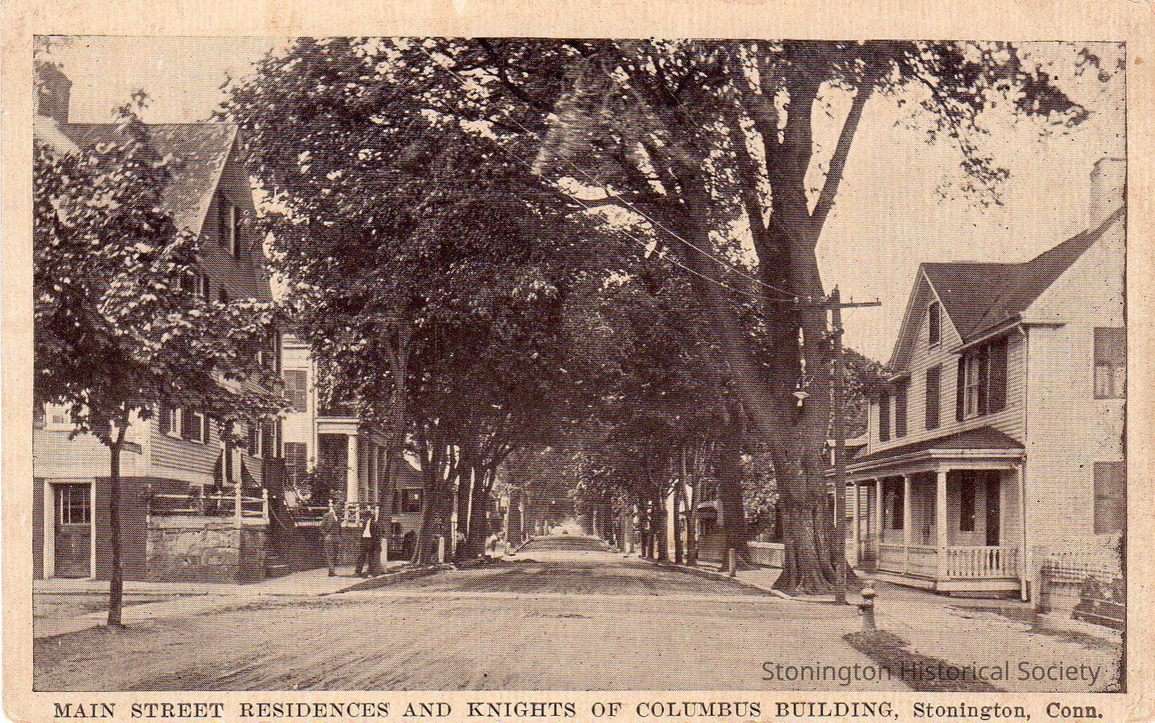 Postcard, "Main Street Residences and Knights of Columbus Building, Stonington, Conn.," c. 1910. Corner of Main Street and Wall Street looking North (Whistler residence and Portuguese Holy Ghost Society are visible on the left). Belonged to Henry R. Palmer, Jr.