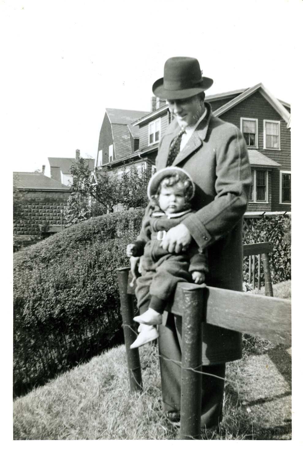 A small black and white photograph of a man standing with a young child. The man is standing near a fence with a fedora and long dark coat. Seated on the fence is a young child in a woolen suit, probably about a year old. Both people are unidentified.Collection