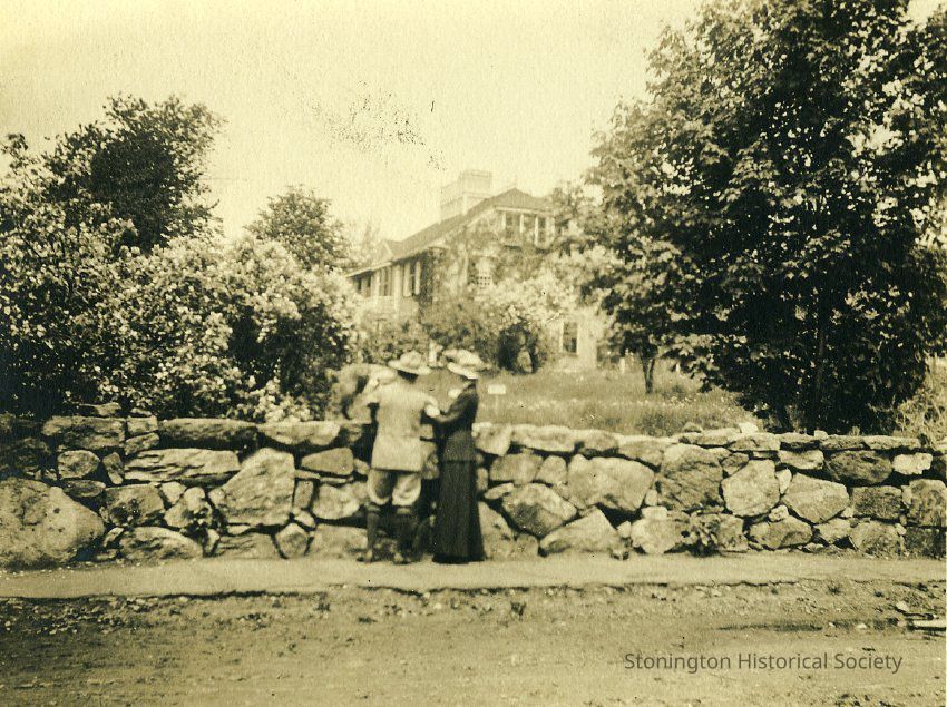 Man and woman at stone wall looking at "The Hill," residence at 35 Grand Street