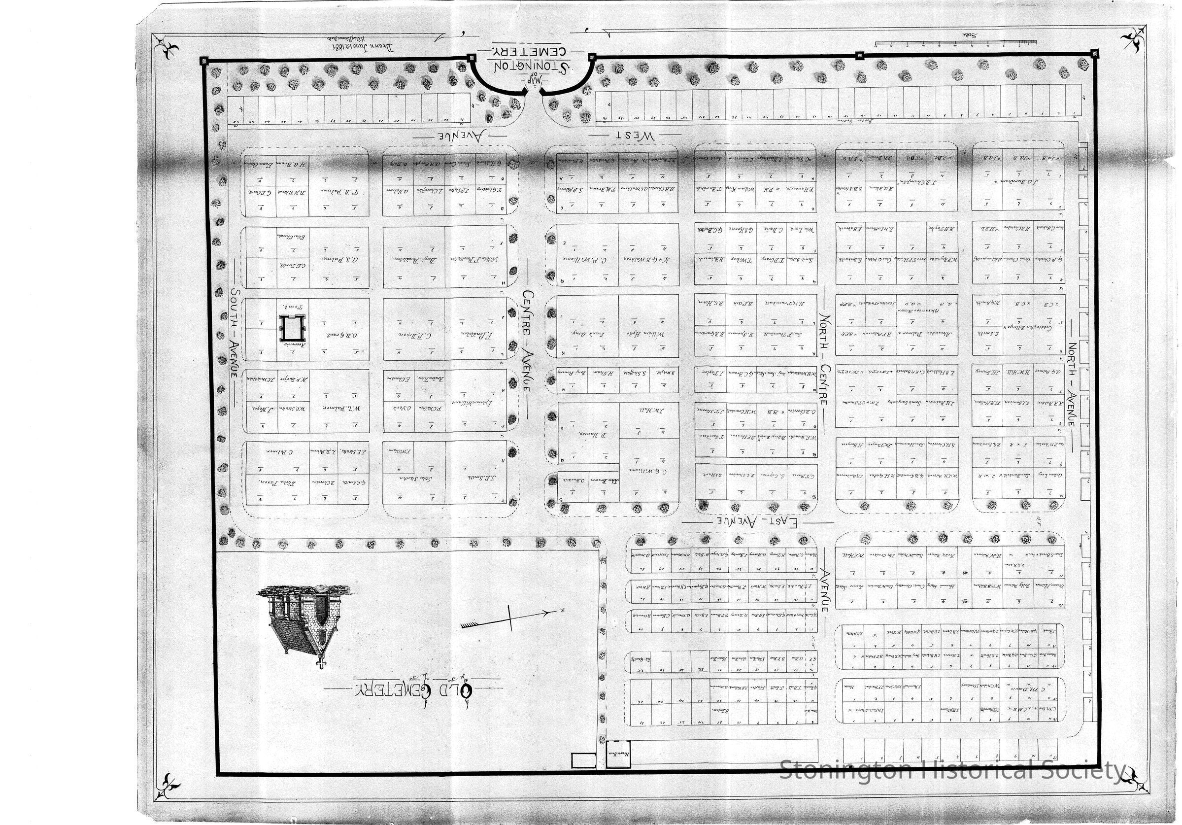 Technical drawing of Stonington Cemetery done June 1 1881 by H. Clay Palmer, Art.