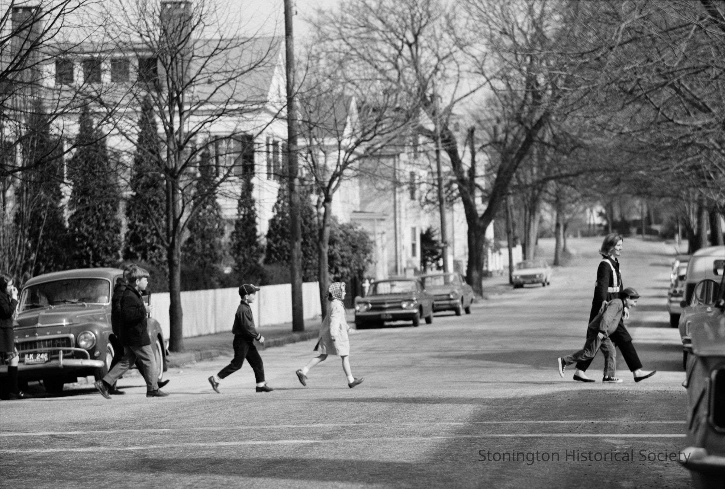 This photograph shows Marilyn Riley, crossing guard, leading a group of five children across Main Street in 1968. One little boy is walking beside Marilyn, while the others trail behind. The one little girl in the group has a plaid handkerchief tied around her hair.Collection