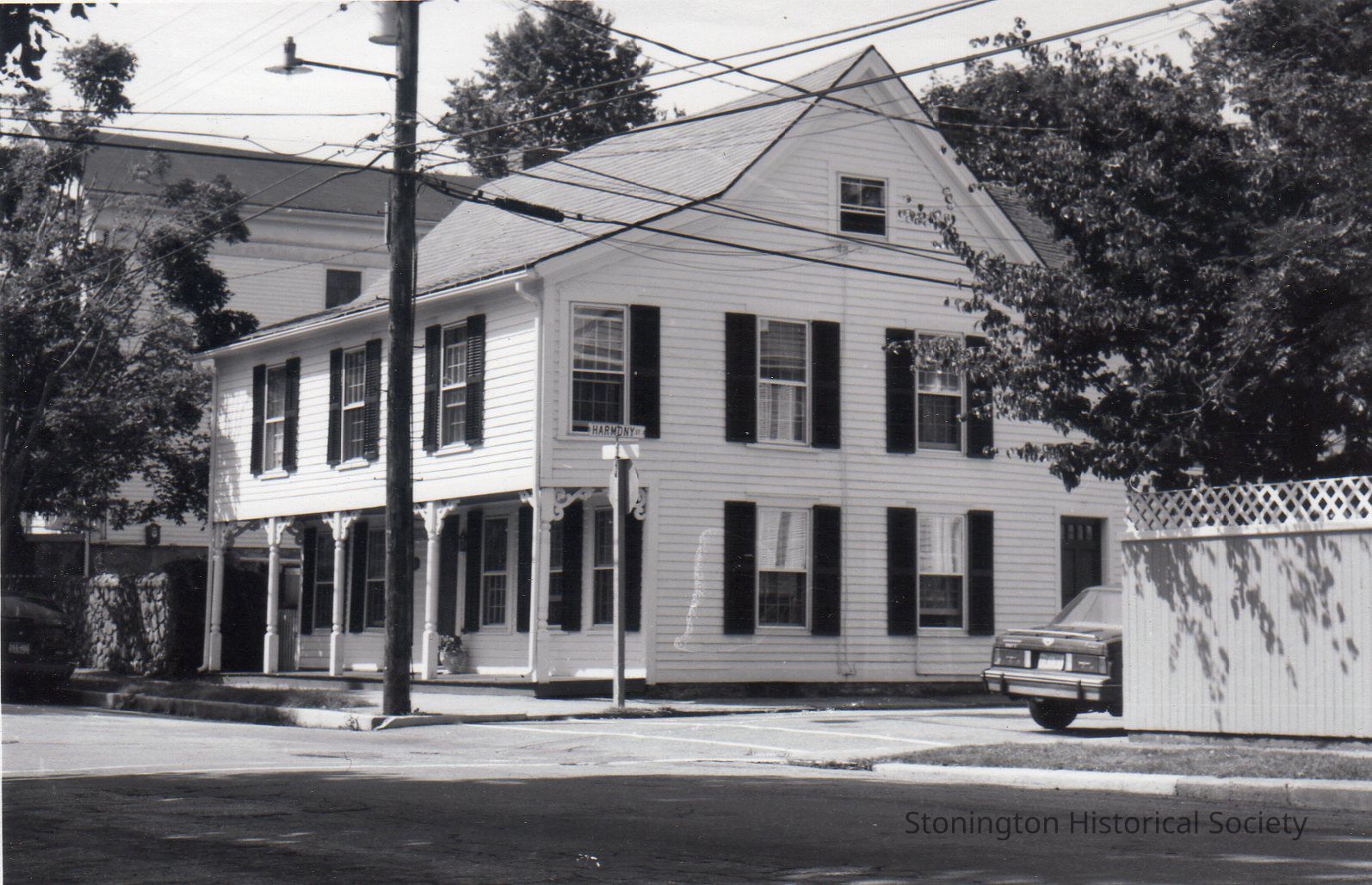 Black and white photograph postcard, intersection of Main Street and Harmony Street (view of 32 Main Street). Photograph by Maurice LaGrua.Collection