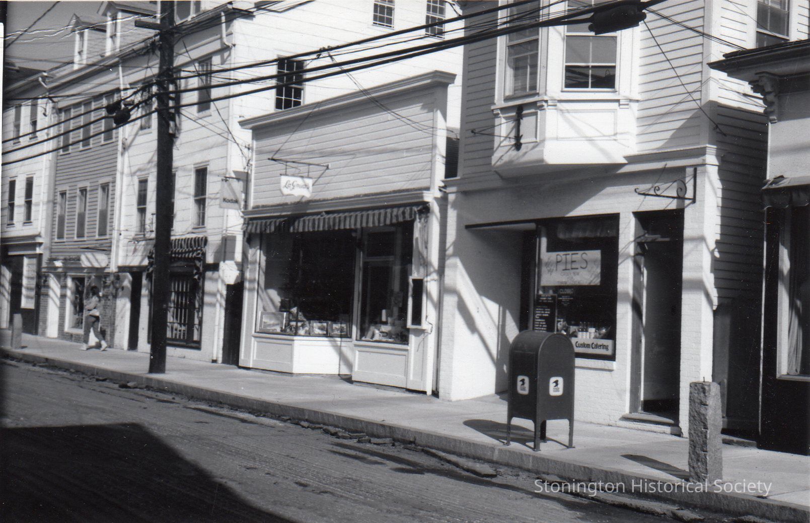 Black and white photograph postcard, looking north up Water Street (119 Water Street, 121 Water Street), storefronts for LaGrua's and Sugar and Spice are visible. Photograph by Maurice LaGrua.Collection