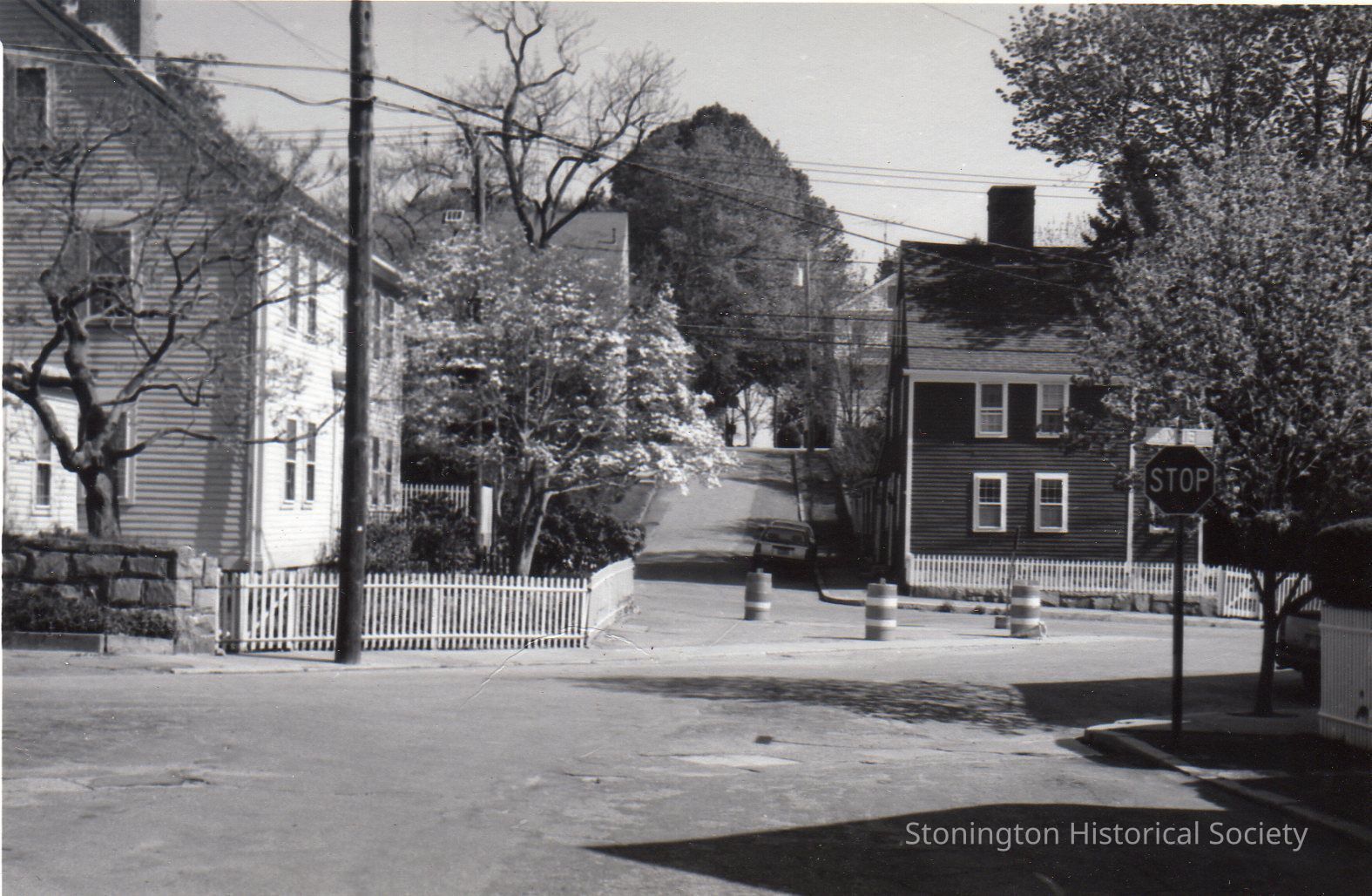 Black and white photograph postcard, intersection of Cliff and High Street (view of 17 Cliff Street). Photograph by Maurice LaGrua.Collection