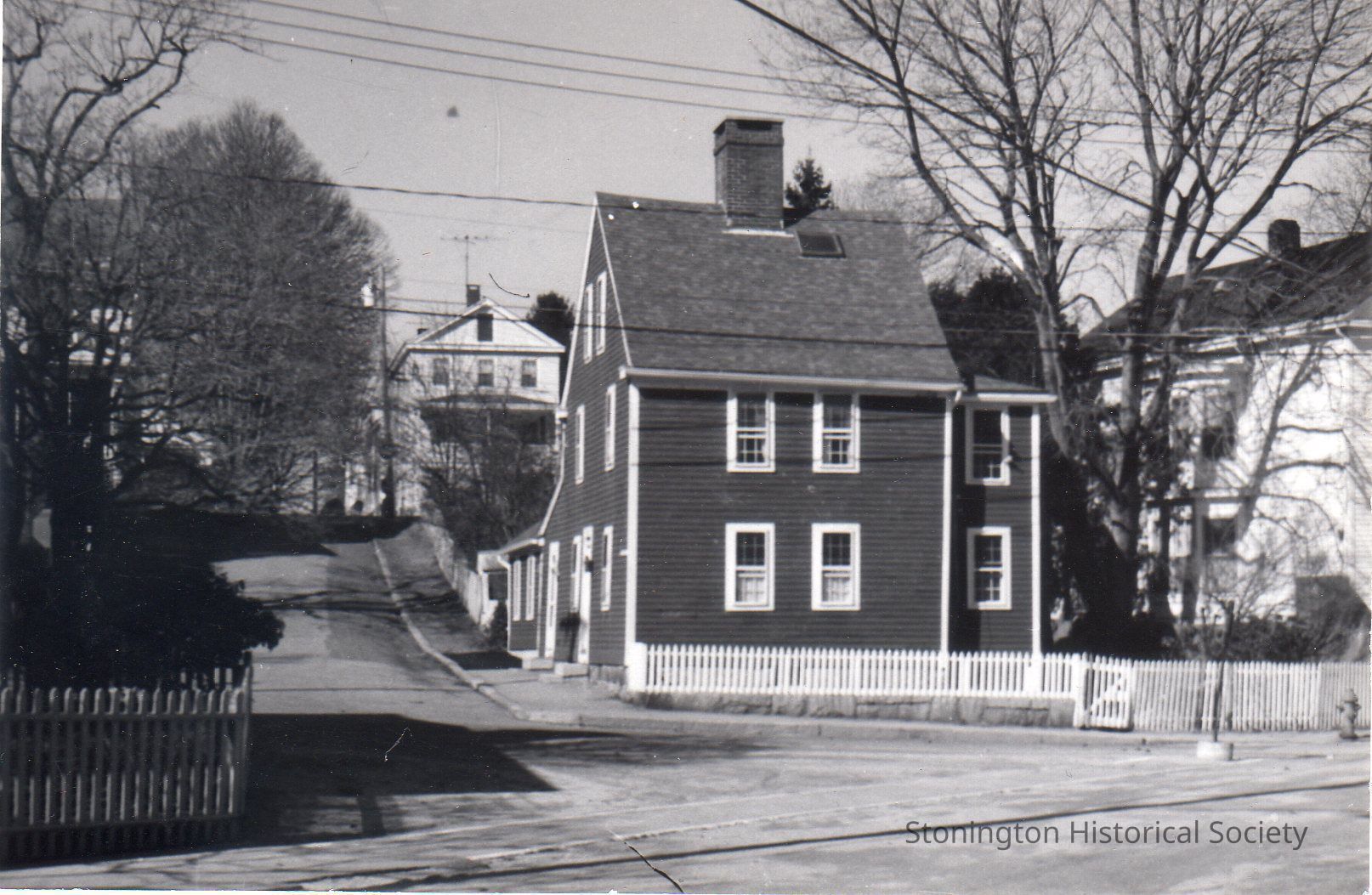 Black and white photograph postcard, intersection of Cliff and High Street (view of 17 Cliff Street). Photograph by Maurice LaGrua.Collection