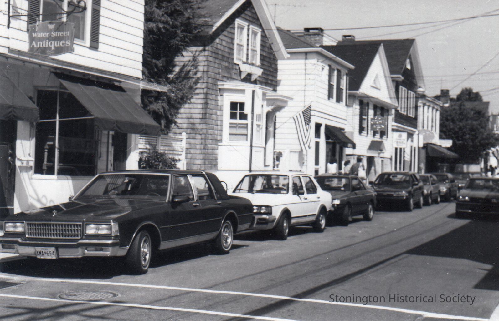 Black and white photograph postcard, looking north up Water Street (116 Water Street, 118 Water Street, 120 Water Street, 124 Water Street, 134 Water Street). Photograph by Maurice LaGrua.Collection