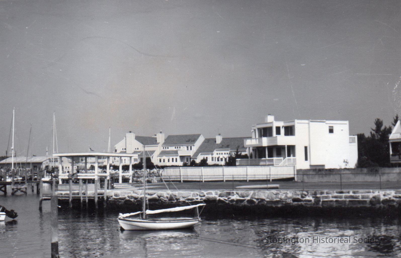 Black and white photograph postcard, waterfront in Stonington Borough near the intersection of Northwest Street and Church Street. Photograph by Maurice LaGrua.Collection