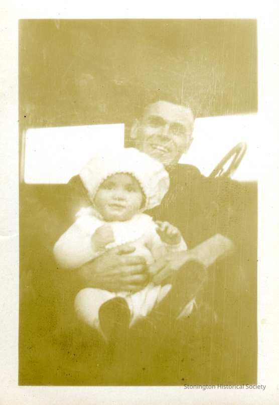 A very small photograph of Merton P. Clark sitting in a car with his daughter Carolyn on his lap. Carolyn is wearing a funny white bonnet. Back of the photograph reads "Daddy & Carolyn Clark".Collection