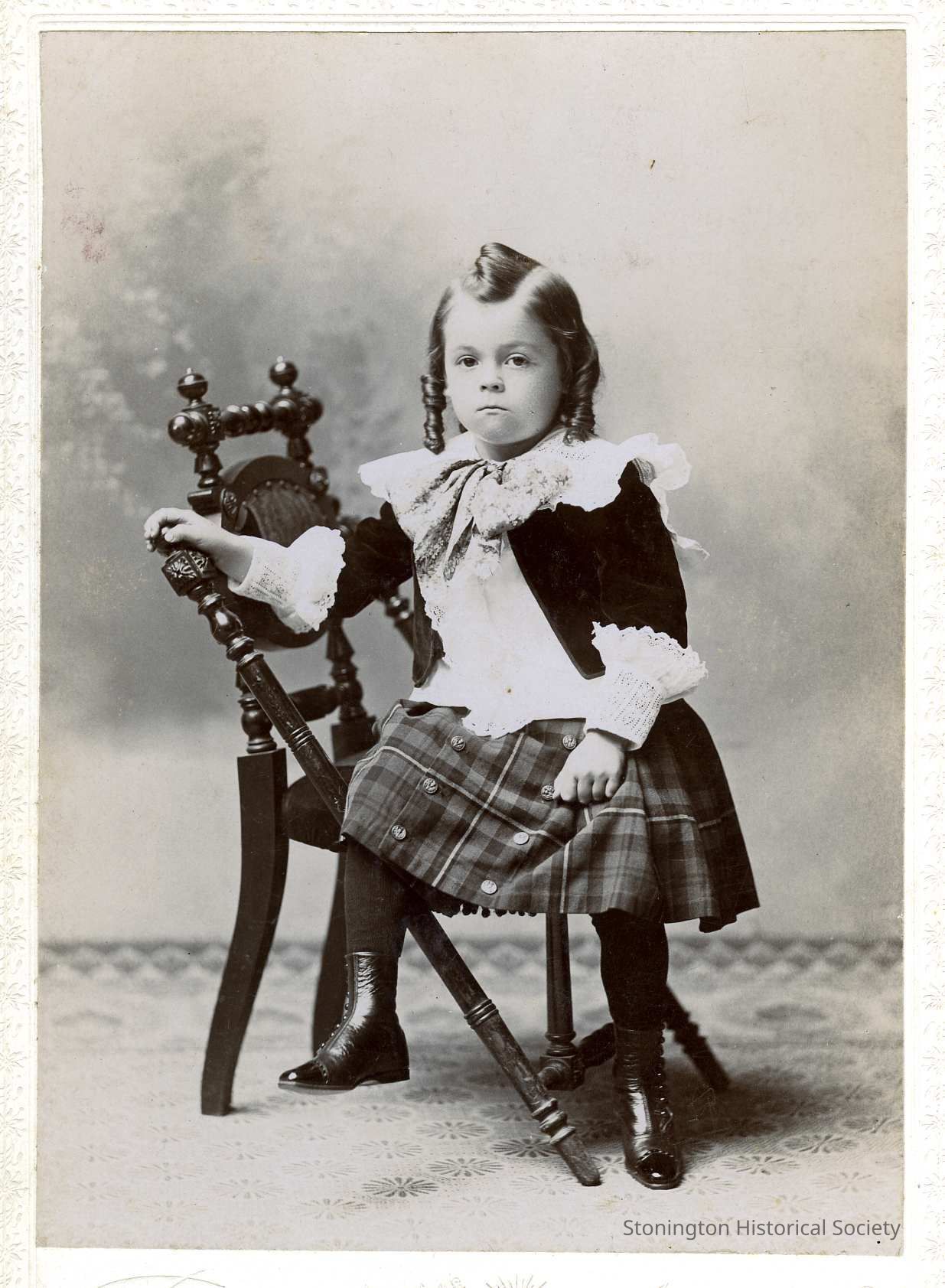 A black and white portrait photograph of Merton Perry Clark. He is wearing a kilt, facing the camera with a frilly collar. The reverse reads: "Merton Perry Clark, born June 25, 1892 at about 4 years old. Lived until August 2, 1991. 99 years, 1 month, 8 days."