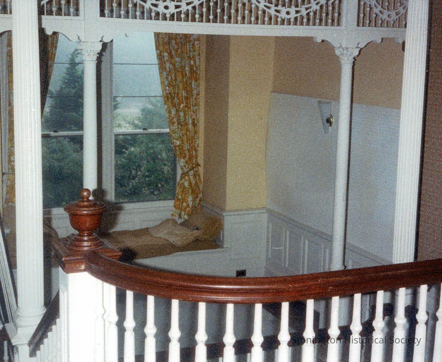 Photograph taken around the year 2000 of the mezzanine level of Bella Vista, 166 Elm Street, by Rae and Steven Singer after purchasing the property. The home was originally built by Edward E. Bradley around 1901 and features many original architectural and ornamental details. These photographs were taken to document the state of the house before it underwent cosmetic and some interior structural renovations by the Singers. This photograph shows the mezzanine level of the staircase, as taken from the second floor hallway.Collection