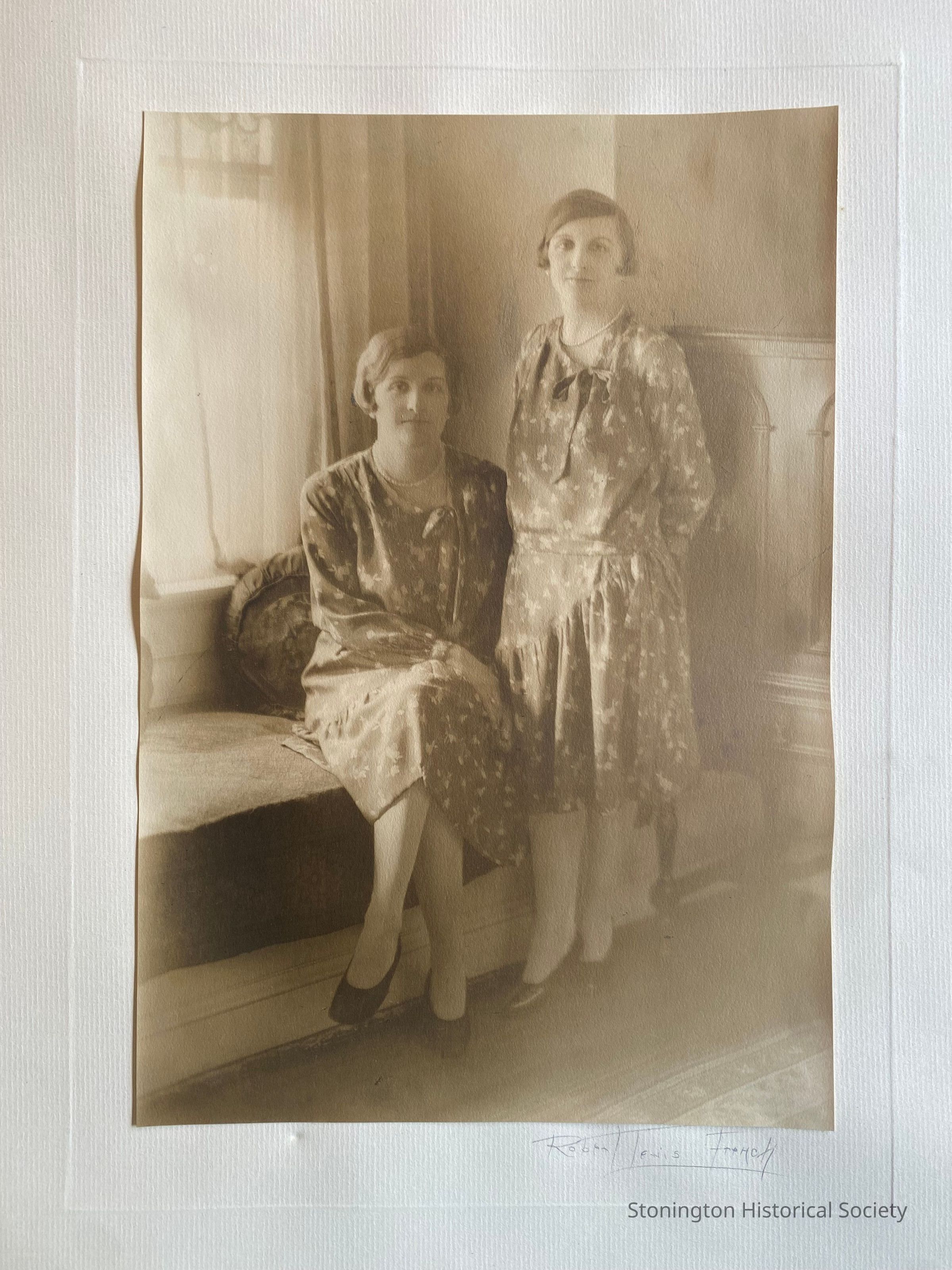 Professional portrait photograph of Mildred Gray Bradley, the second wife of Edward E. Bradley and her twin sister Marion Gray Bradley, the wife of Major Eric T. Bradley. The photograph is undated but appears to be late 1920s or early 1930s. The sisters are standing in Bella Vista, 166 Elm Street.Collection