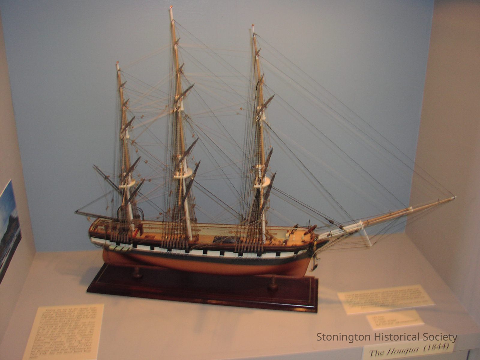 Fully rigged scale model of the Houqua. 3 masts, white, black and brown Hull brown, black, and white with windows along sides
