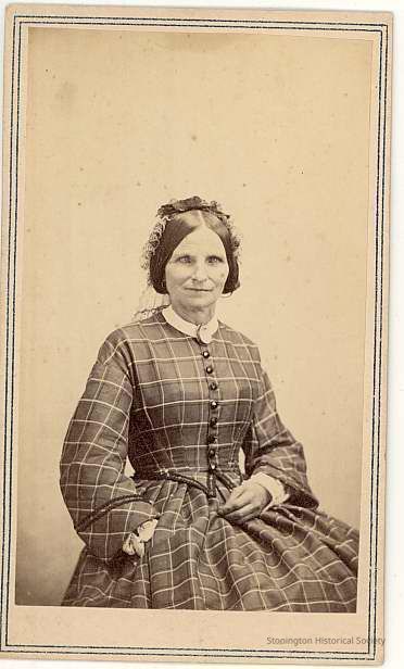 3/4 seated photo of woman in checked dress with white collar, brooch, headdress