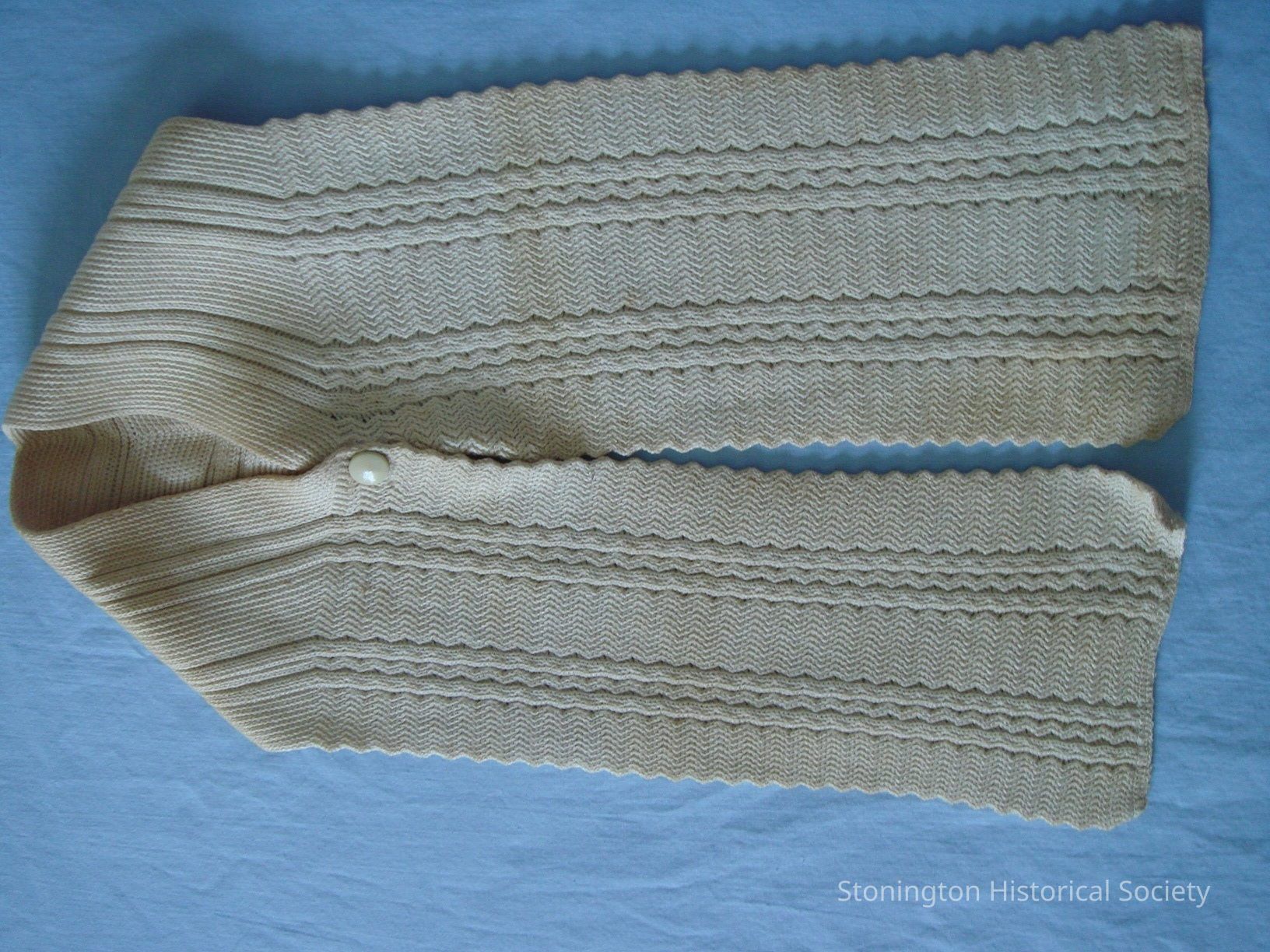 machine knitted cotton cream colored muffler single snap closure label: Phoenix July 5, 1910 Pattoned muffler design Patton June 9, 1902