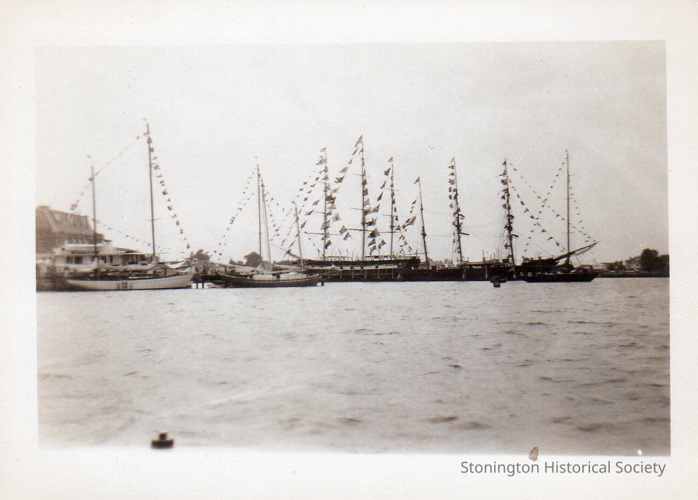 Collection of black and white snapshots. Individual photographs are unidentified, but appear to be the the Stonington side of Mystic in the 1940s. Photographs include a boat launch on River Road with a view of Elm Grove Cemetery in the background, numerous views of the Mystic Seaport Museum and CHARLES W. MORGAN (arrived in Mystic in 1941) and the shoreline along the east bank of the Mystic River between the drawbridge and the Mystic Seaport Museum.Made/Created