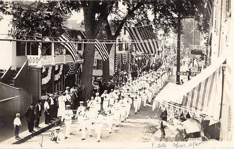 Mystic Hook and Ladder company on Water Street during Fire Parade, part of Celebration of the Battle of Stonington, 1914. Note on back adds that the Deep River Drum Corps followed them.