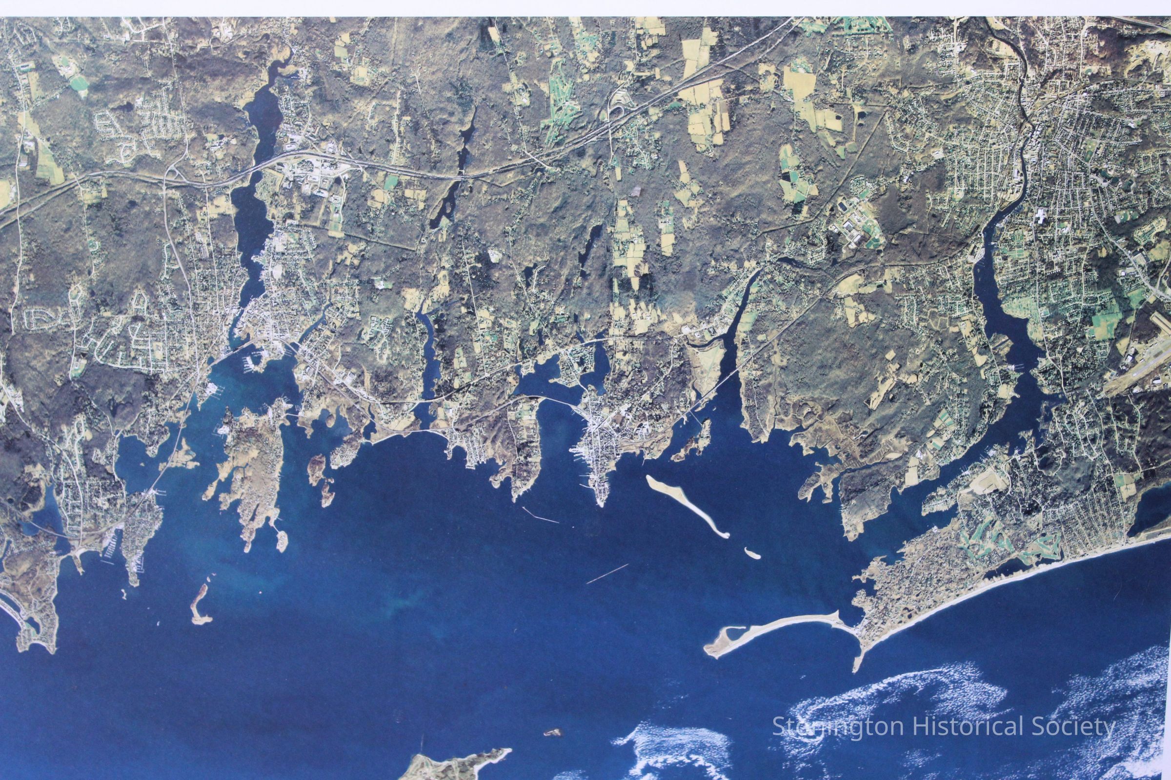 Framed and matted photograph created by SkyTop Images measuring 18.75 inches tall and 24.75 inches wide. The photograph seems to hvae been taken by satellite and provides an aerial view of Watch Hill, including Napatree Point over to Groton and Noank on the west. Frame is slightly worn, but matting and image appear in good condition.Collection