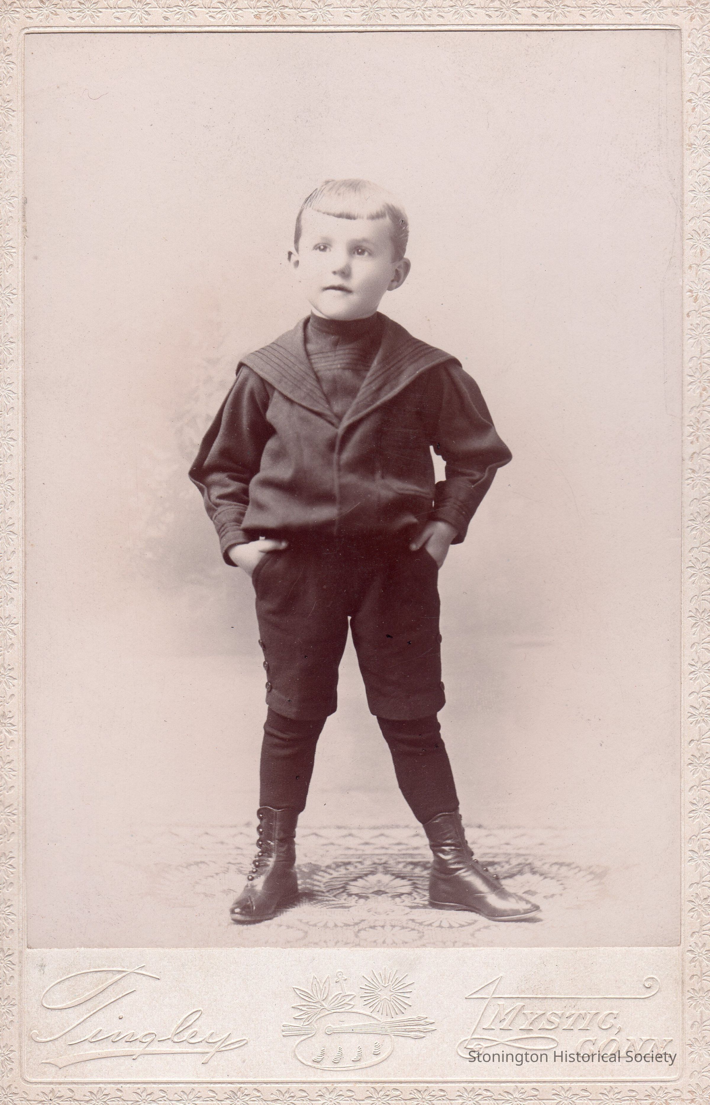 Photograph of Nathan Stanton Gates, Jr. (Sept. 24, 1890 - Jun. 27, 1897) of Mystic, age 5, September 1895, photographed by George Tingley, Mystic, Conn. Nathan was the son of Nathan Stanton Gates and Anne Borodell Gates, and is buried at Elm Grove Cemetery. From the Haynes family photograph album.Collection