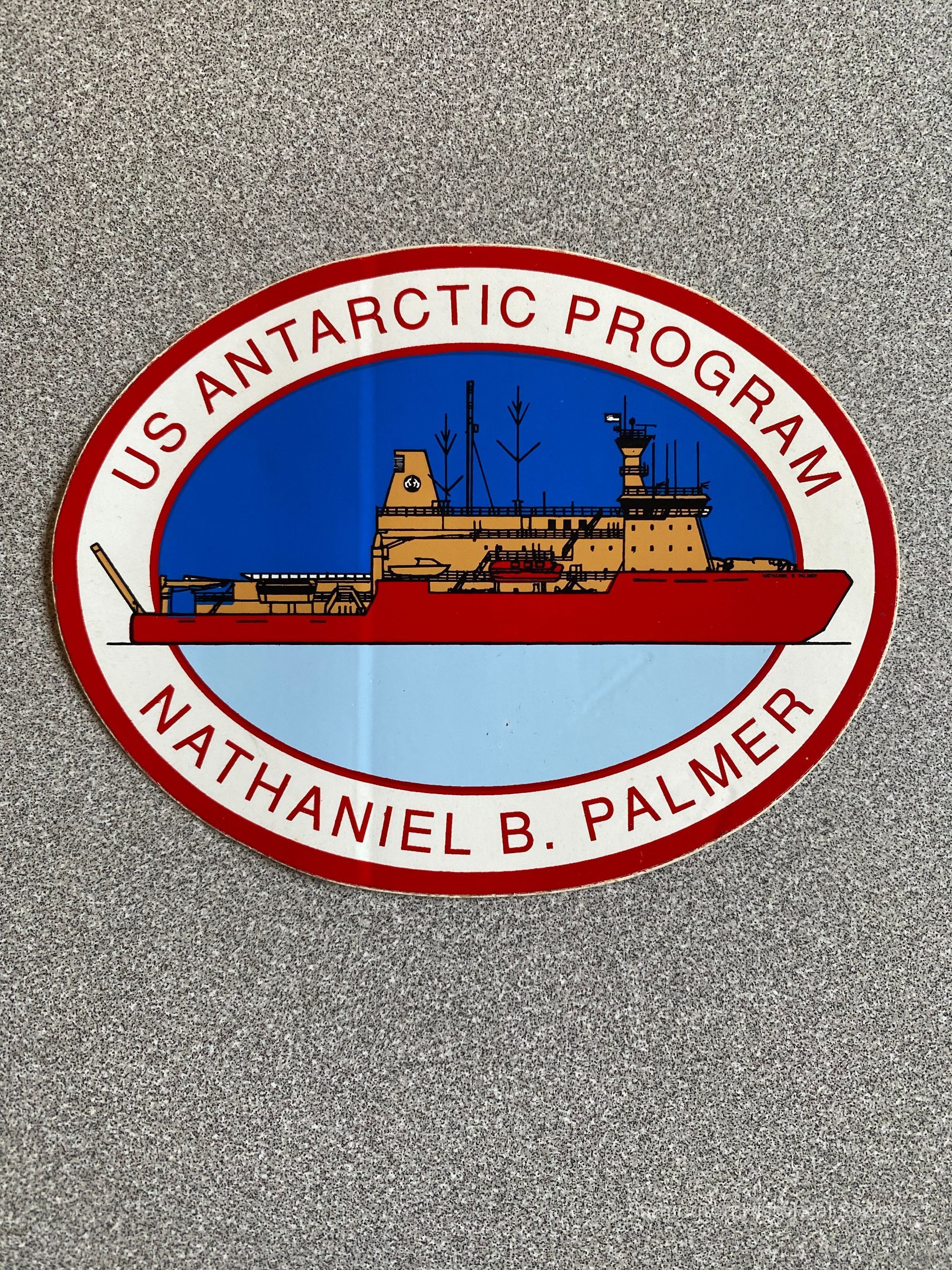 US Antarctic Program bumper sticker, depicting the Research Vessel "Nathaniel B. Palmer". No makers mark, probably purchased in the gift shop on Anvers Island/Palmer Station. The NB Palmer was launched in 1992.Collection