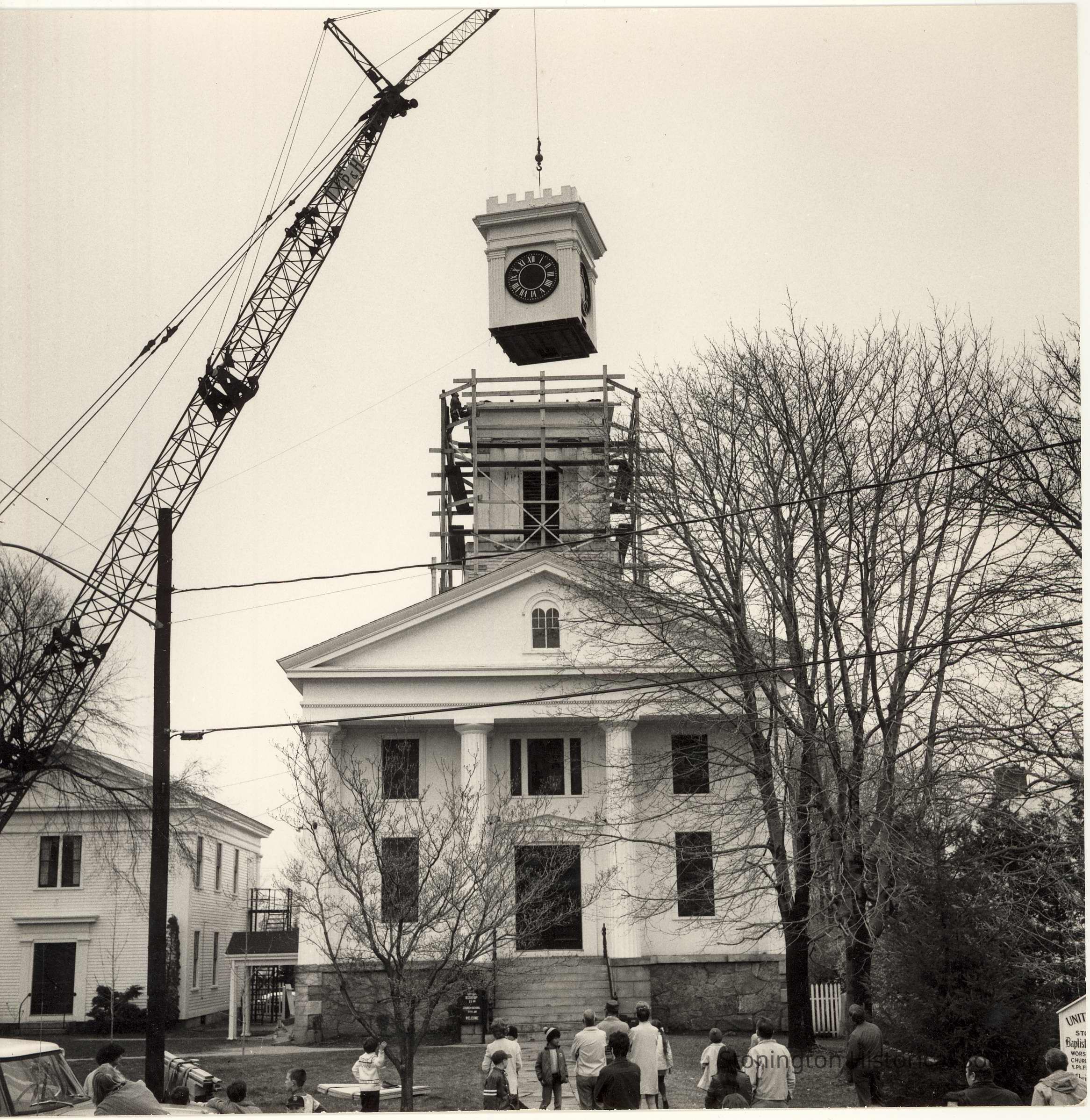Congregational Church on Main Street showing the new tower being put into place. Date on back of photo is 5/9/72