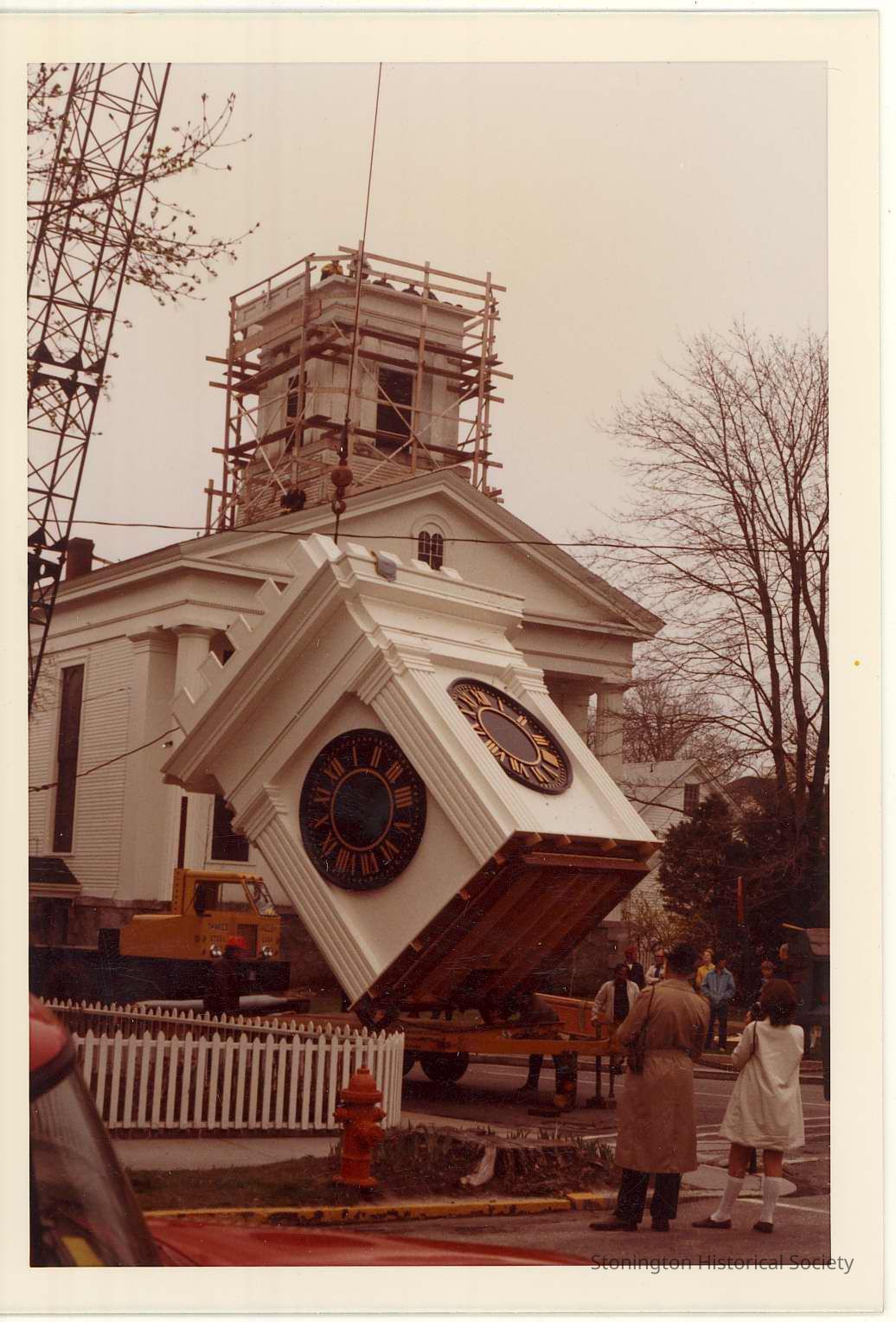 United/Congregational Church on Main Street showing the new tower being put into place. Possibly not taken by Rollie since she is in one of the photos