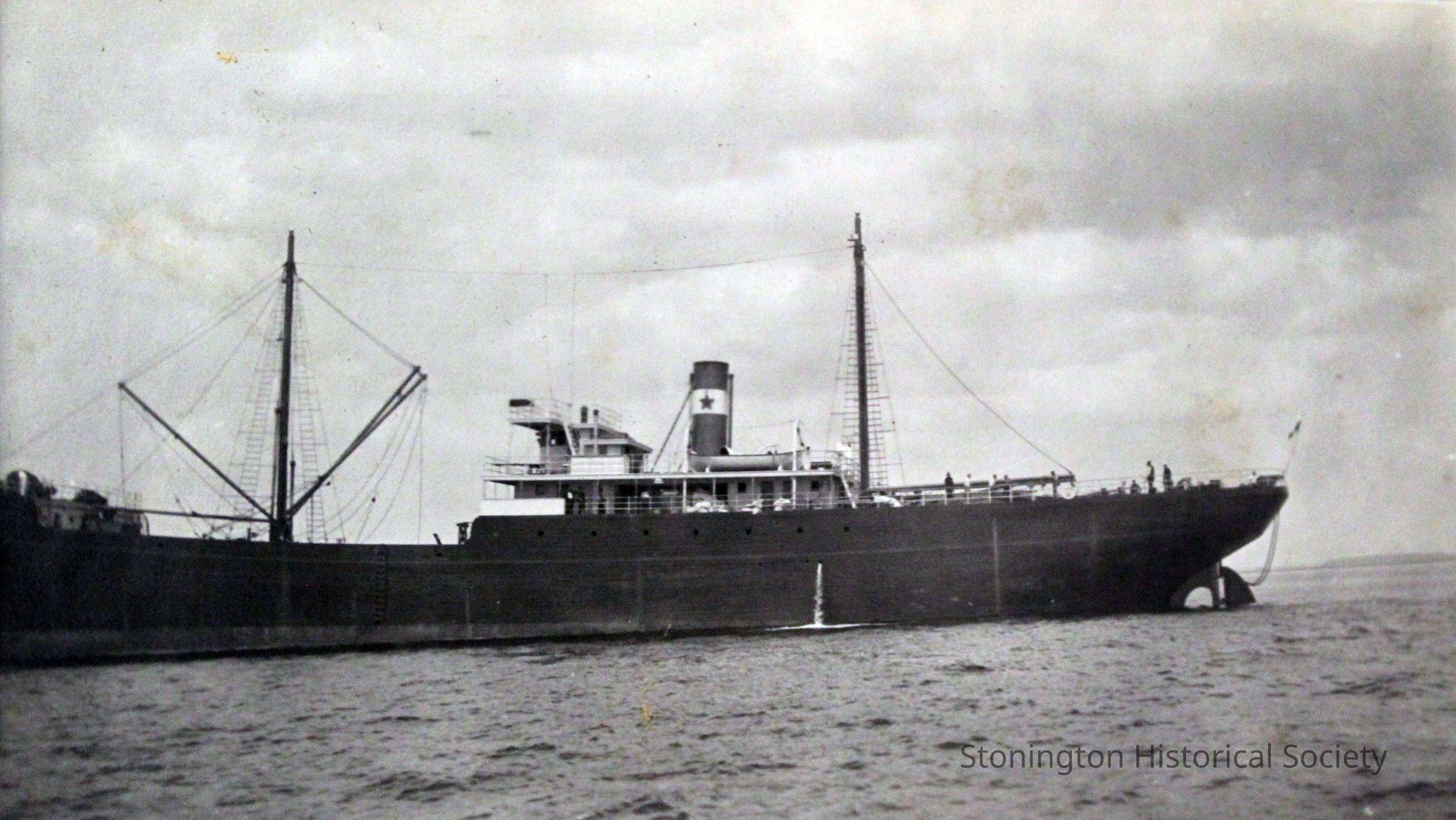 View of the newly rebuilt SS Lansing from the water, after its launch into Stonington Harbor in May 1919. The Lansing steamship was rebuilt by the Ship Construction and Trading Company, Inc. of Stonington for the Nafra Company of New York.Made/Created