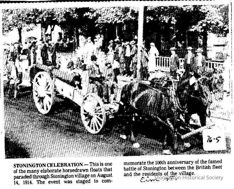 Newsclipping showing horse-drawn float carrying cannon during parade, Elm Street, Stonington CTEntry/Object ID