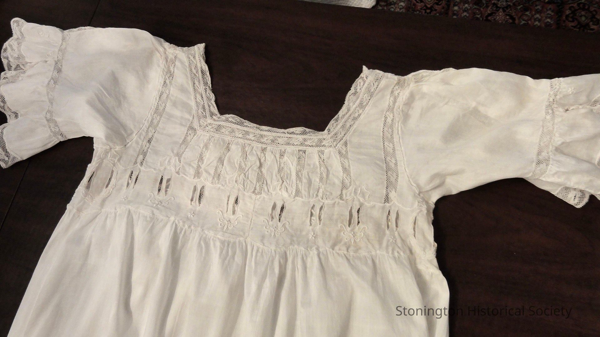 from shoulder to short sleeve there is a lace panel with 2 embroidered wreaths with openings to thread ribbon