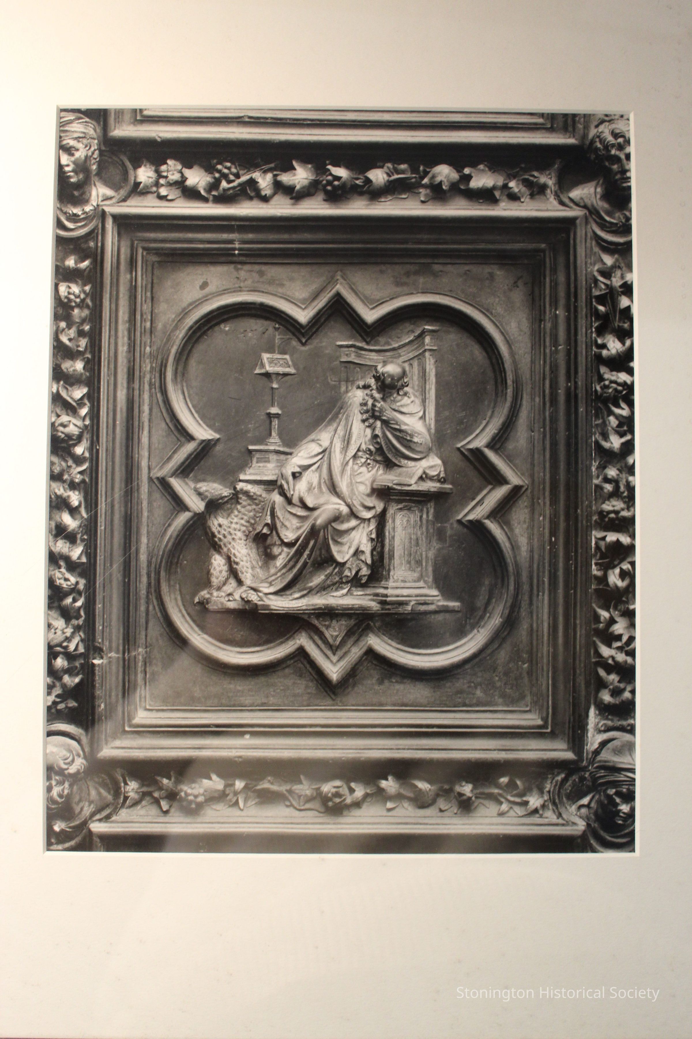 Framed black and white close up of the North door of Saint John the Evangelist Baptistery, in Florence, Italy as taken by Rollie McKenna. These doors were designed by Lorenzo Ghiberti and this particular image is of Saint John the Evangelist.