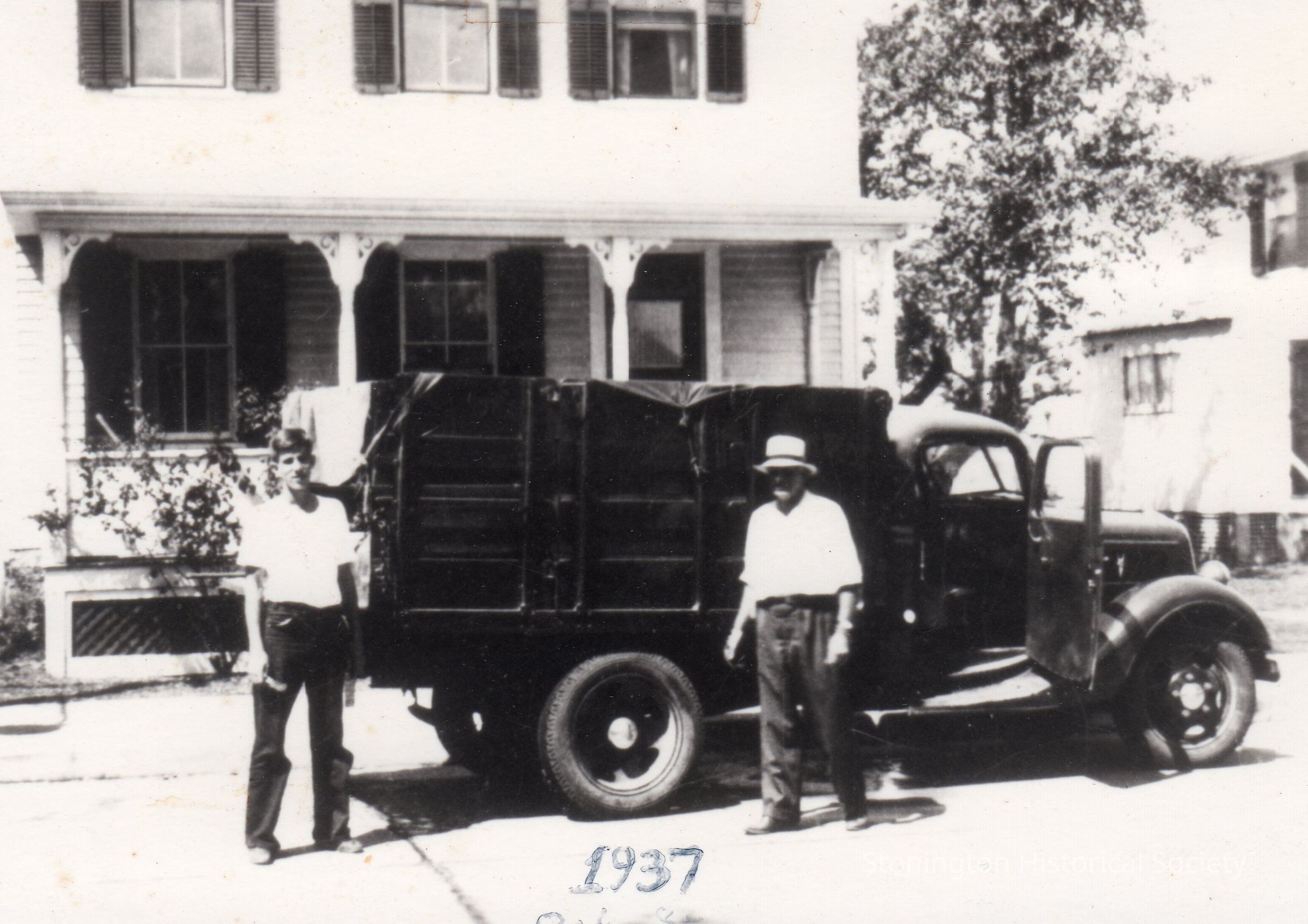 Black and white snapshot, 2 men on Oak Street, Stonington Borough, 1937, part of a collection of previous exhibit photographs from the Lighthouse Museum.
