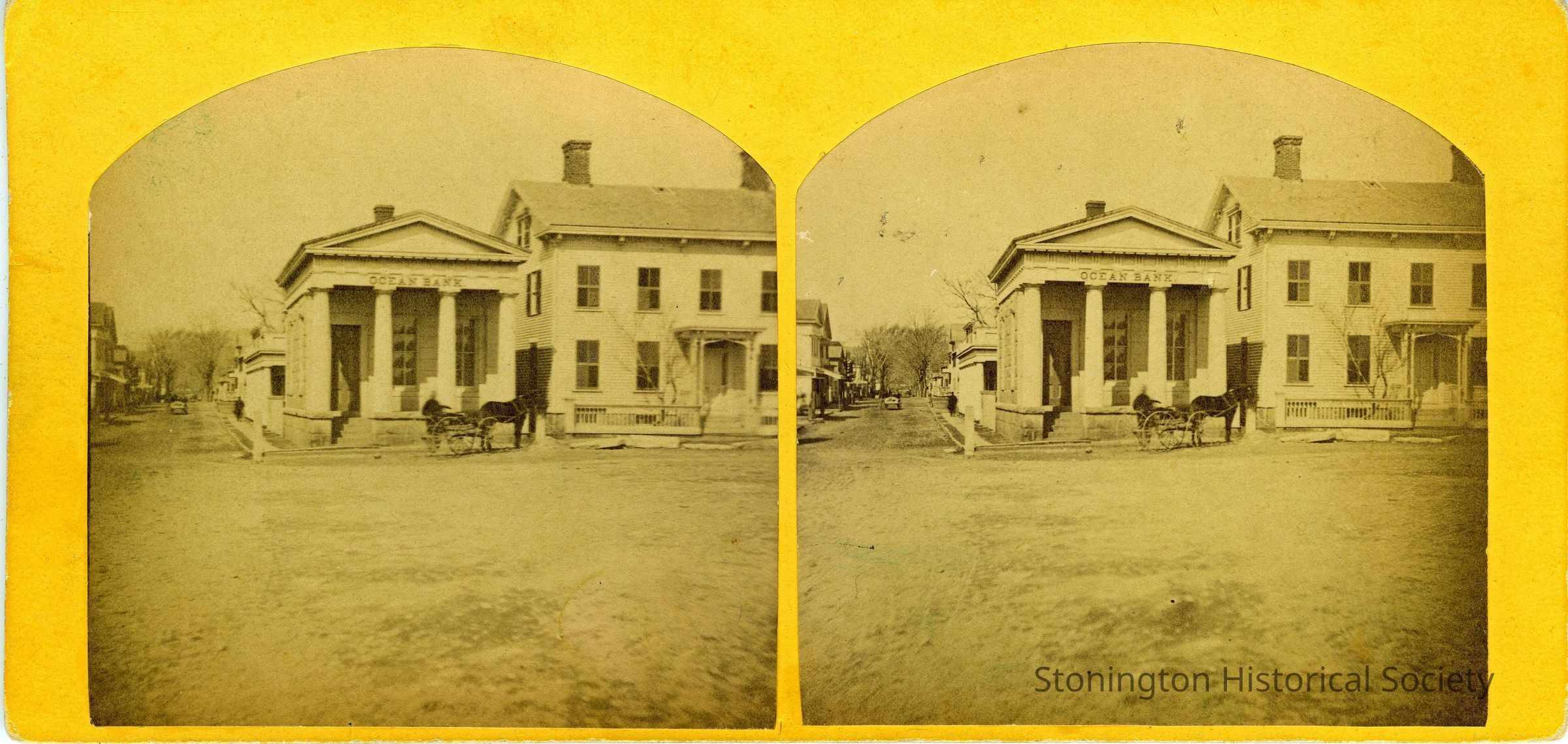 Stereo photograph of Ocean Bank with horse and buggy at what later became Cannon Square, looking North on Water Street. Arcade building just beyond bank.
