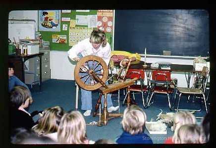 Demonstration by Mrs. Smith of oiling the spinning wheel to students at Dean's Mill SchoolCollection
