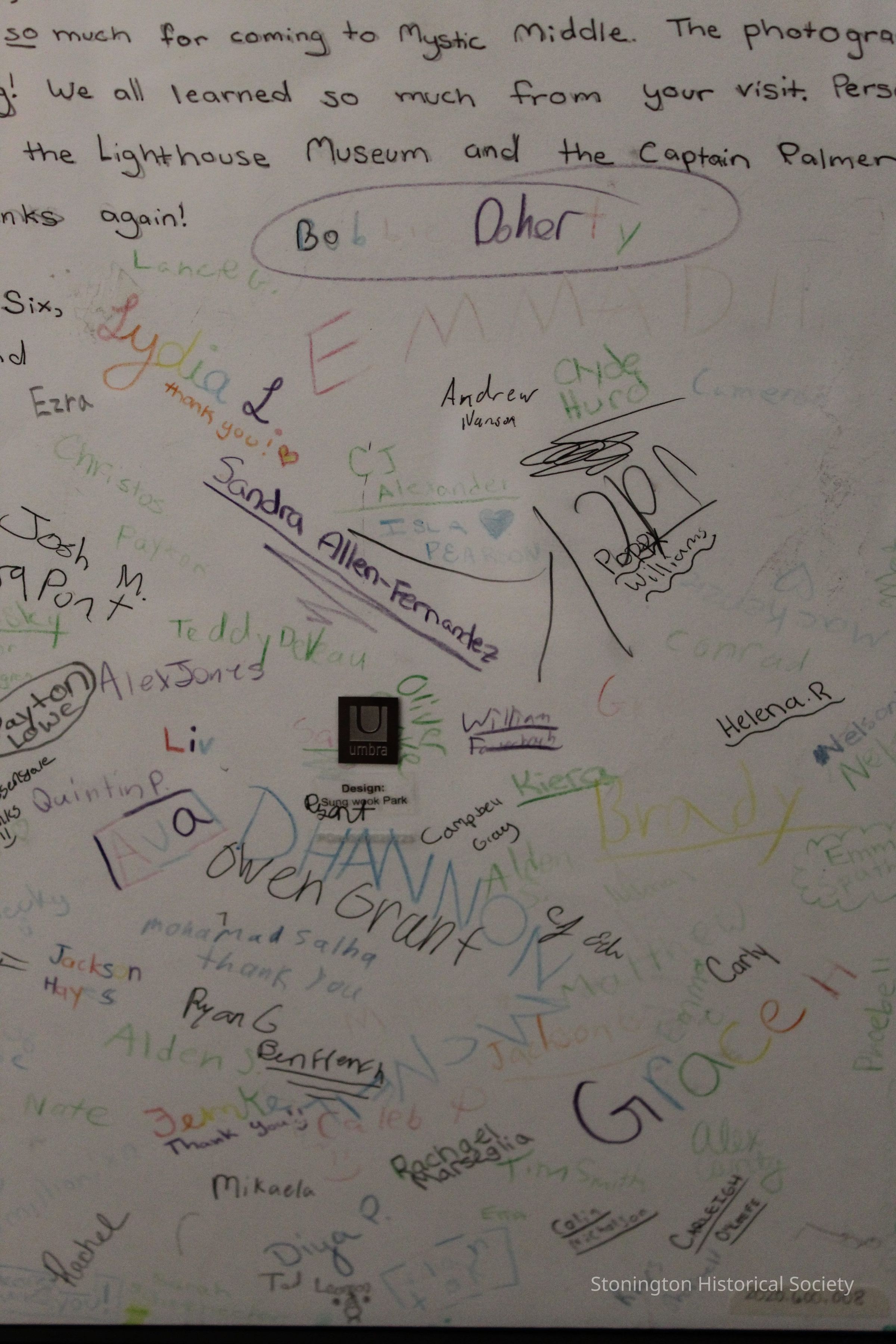 A drawing and watercolor of the Stonington Lighthouse or Old Lighthouse Museum as done by Mystic Middle School sixth graders as a thank you to Elizabeth Wood, former Executive Director of the Historical Society, for coming to speak to their class on the history of the town. The back has a little note that reads: "Dear Mrs. Wood, Thank you so much for coming to Mystic Middle. The photographs were amazing! We all learned so much from your visit. Personally, I love both the Lighthouse Museum and the Captain Palmer House. Thanks again! The classic six, Catie and " and the rest of the class have written their names on the back.Collection