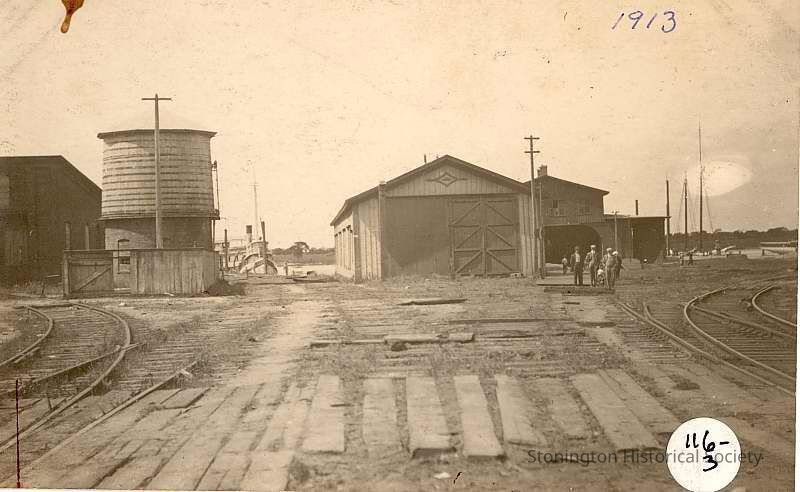 Note on back: N.H.P.R. property, Steamboat Wharf, taken 1913 shows old round house, water tanks, last car sheds at right cetner, tug "Westerly" in slip.