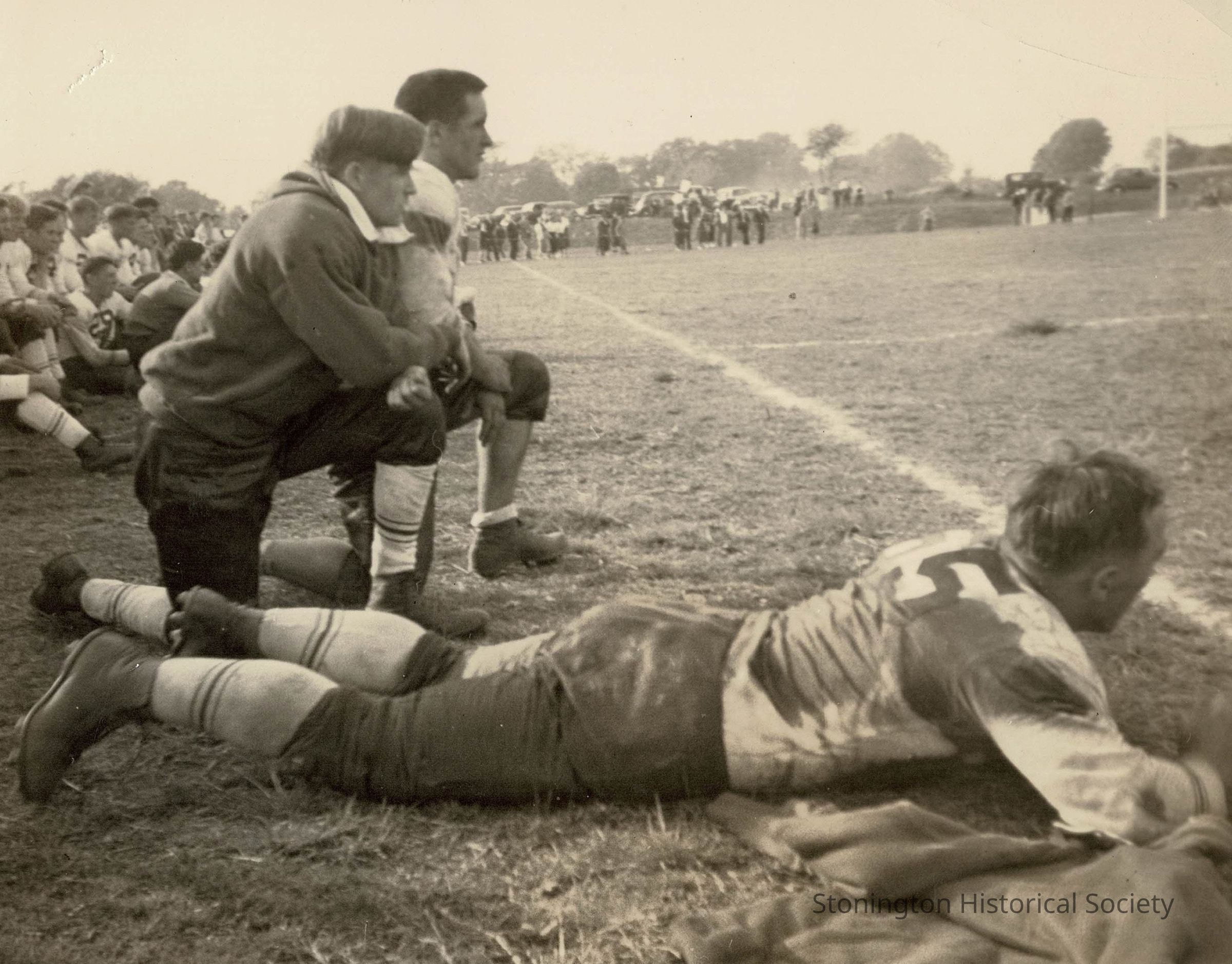 Black and white photograph of the Stonington High School football team's sideline in the 1930s. This photograph was most likely taken on the playing fields behind the modern day high school in Pawcatuck. Later 1930s.Collection