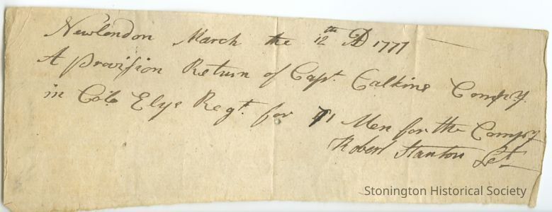 Robert Stanton was a Stonington soldier who served, was a 2nd Lt. in State Regiments in 1776-1777 under the commands of Generals Wooster and Spencer in the 4th Battalion under the command of Col. Jon Ely of Lyme. In January 1777 his regiment marched from New London to Providence because of British threats.Collection