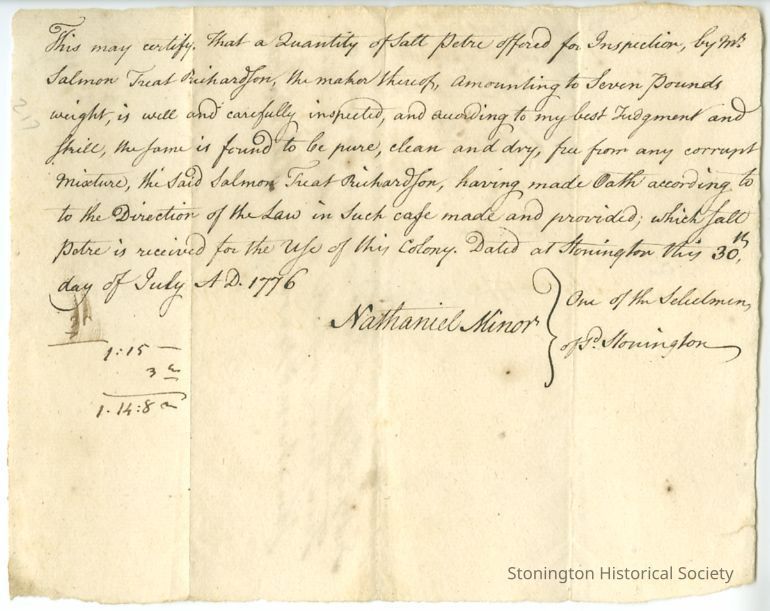 "This may certify that a Quantity of Salt Petre offered for Inspection, by Mr. Salmon Treat Richardson, the maker thereof, amounting to Seven Pounds weight, is well and carefully inspected, and according to my best judgment and skill, the same is found to be pure, clean and dry, free from any corrupt mixture, ..."