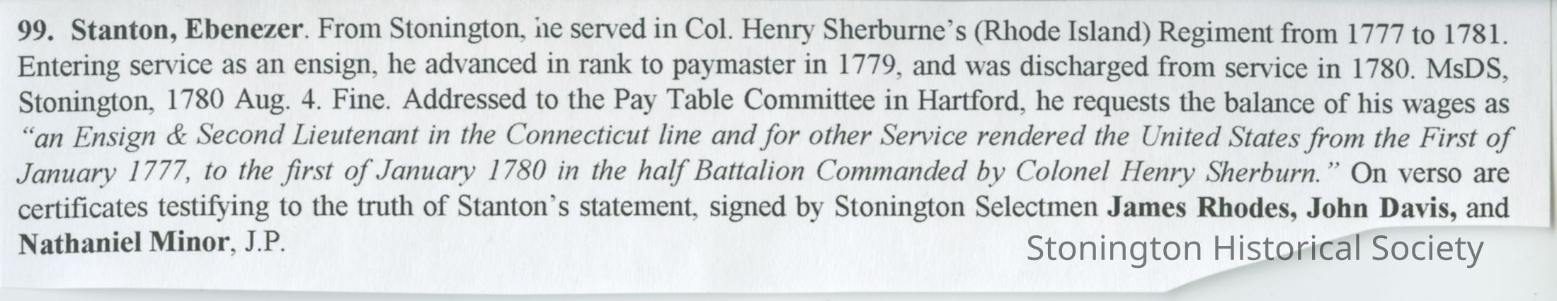 On verso are certificates testifying to Stanton's statement, signed by James Rhodes, John Davis (Selectmen) and Nathaniel Minor, JPCollection